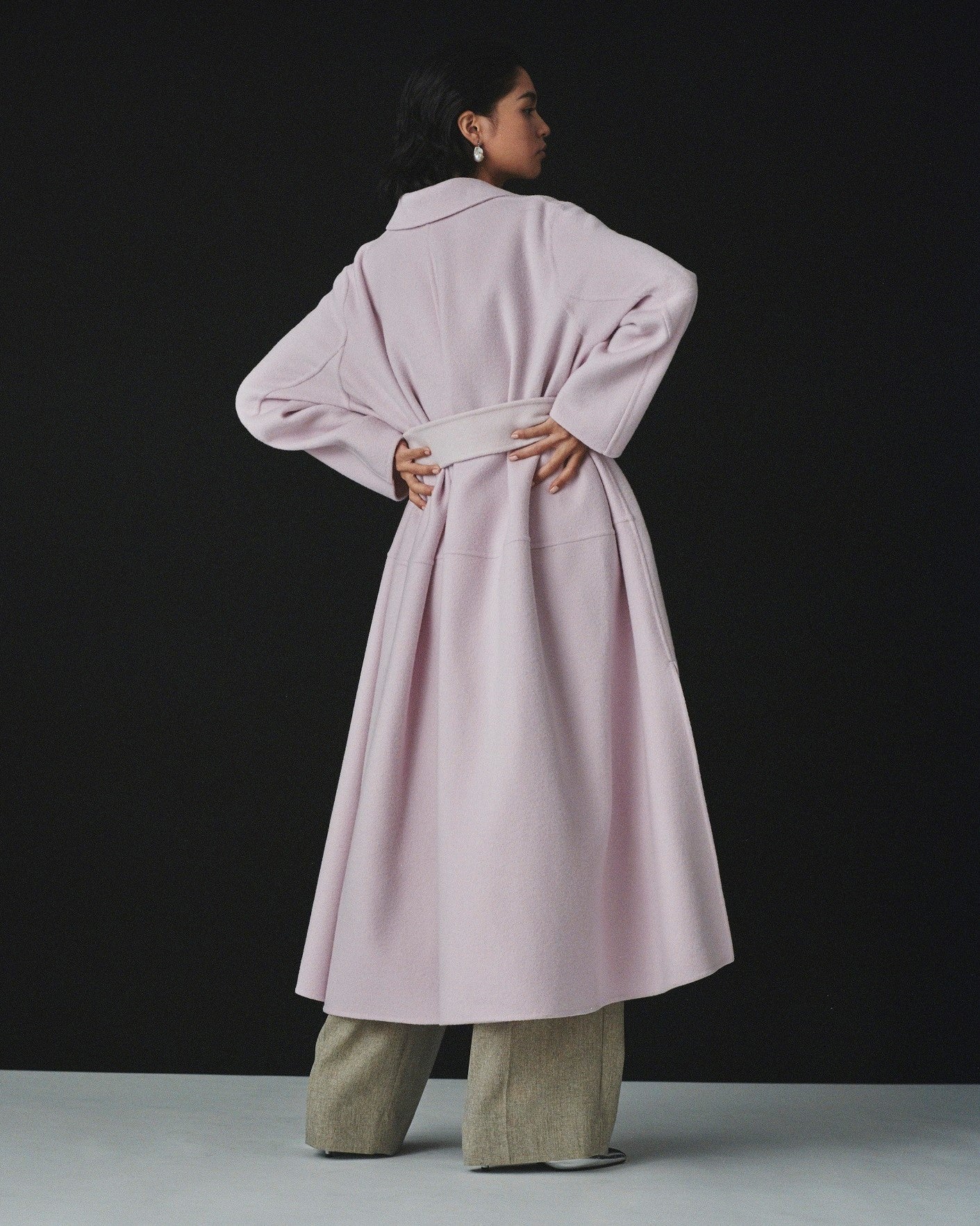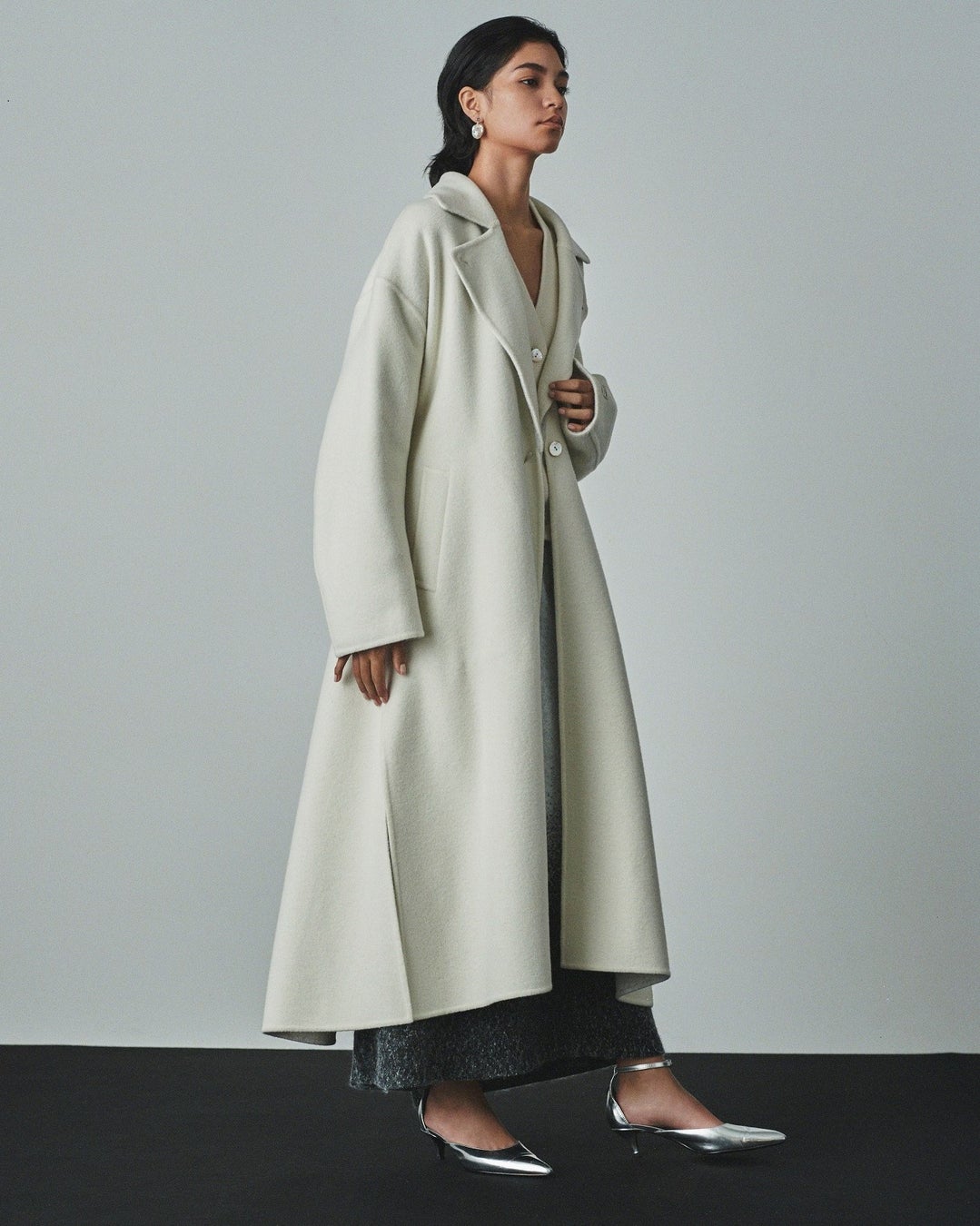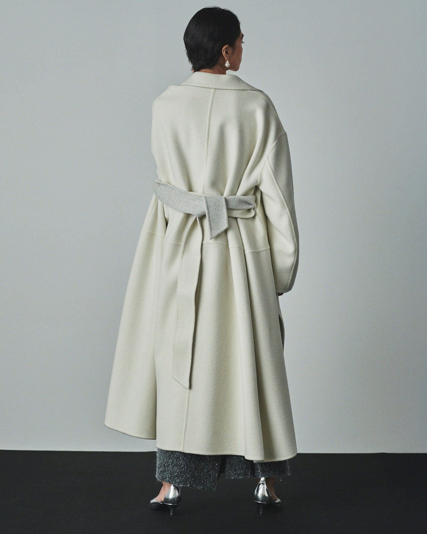 贅沢なボリュームが魅力のドレスコートは、繊細なジーロンウールを使用した尾州産のリバー素材で、上品な光沢とふんわりとした肌触りが特徴的。両サイドに入ったスリットは上品なニュアンスと程よい抜け感をプラスしてくれます。リバーシブル仕立てでコーディネートに合わせた色使いが楽しめます。