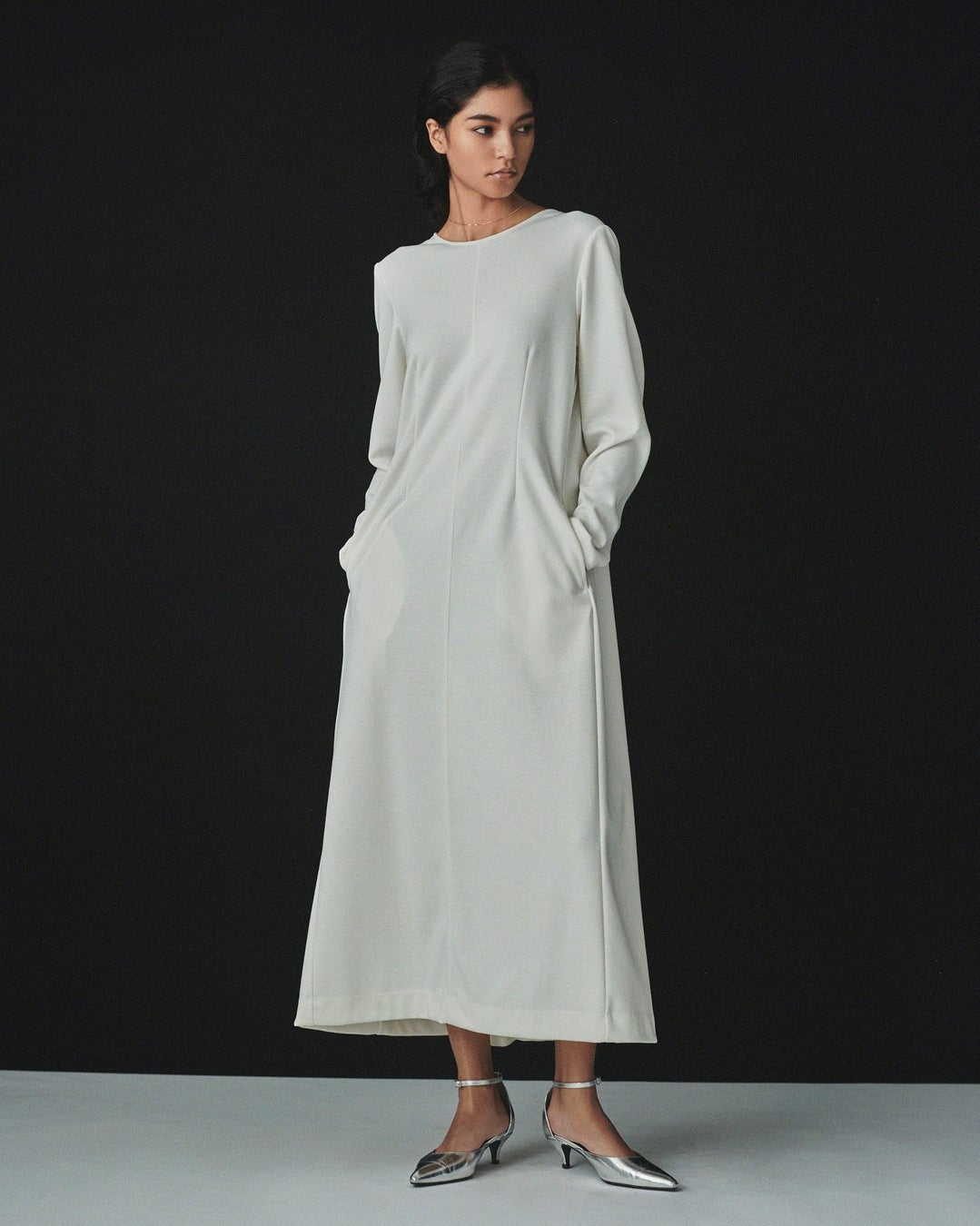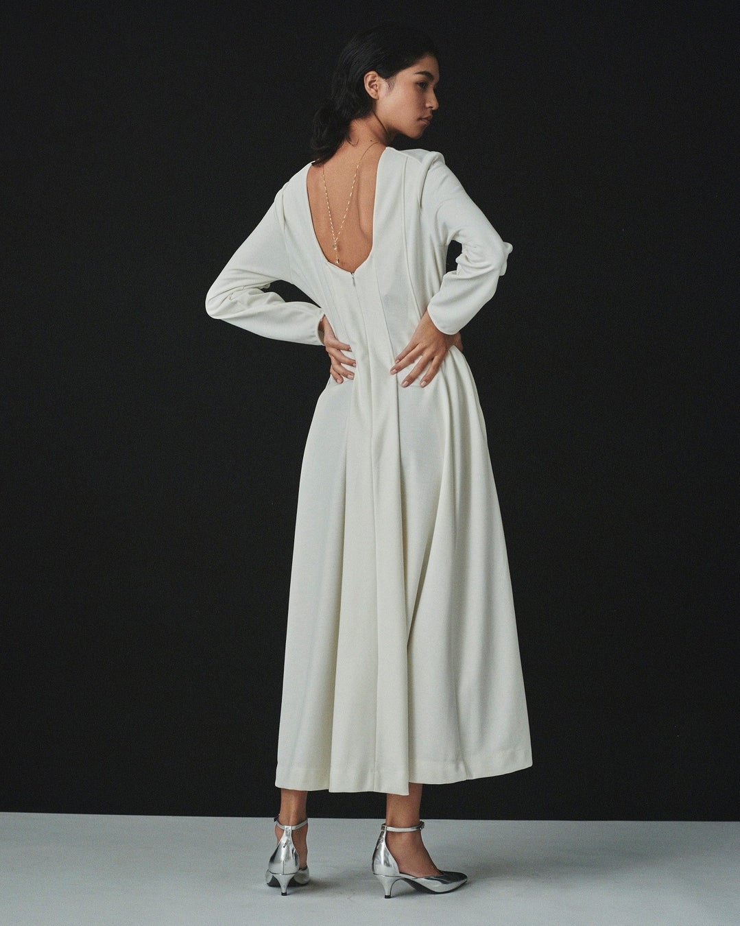 ウール混のしなやかな生地感が魅力的な、ハイゲージポンチを使用したワンピース。潔く開いたバックスタイルにはワイドタックをあしらい、インパクトのあるボリューム感に。ウエストは程よくシェイプされ、柔らかなラインを描きつつもミニマルな印象に仕上げました。ポップアップストア限定カラーは透明感のあるホワイトをセレクト。全店に先駆けて先行発売いたします。