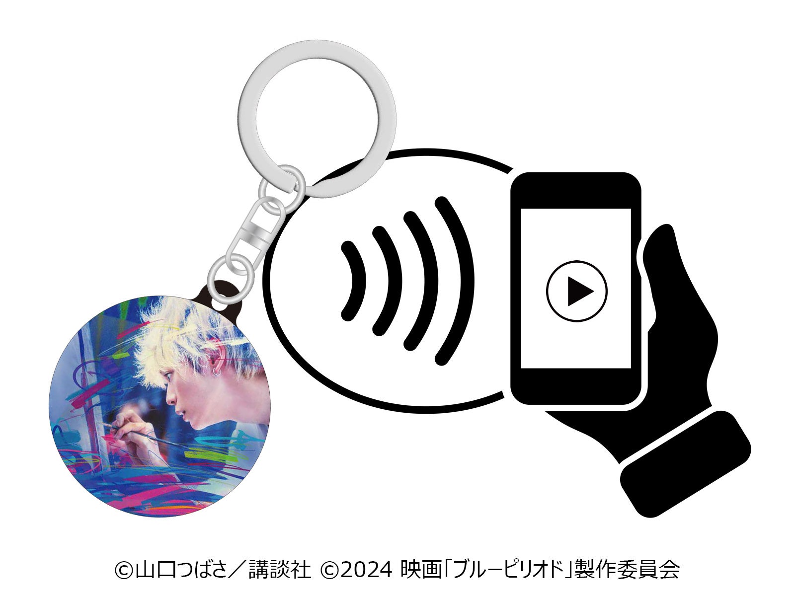今回発売となる映画『ブルーピリオド』の「ミュージックキーチェーン」はスマートフォンを近づけると主題歌WurtS「NOISE」のミュージックビデオ(YouTube)を楽しむことができる。サイズは直径46mmのアナログレコードを模した円形で、通常のキーホルダーとしても使用可能。表面には映画『ブルーピリオド』主演の眞栄田郷敦のビジュアルがあしらわれ、映画・ビジュアル・主題歌が三位一体となったファン必携のアイテムに仕上がっている。