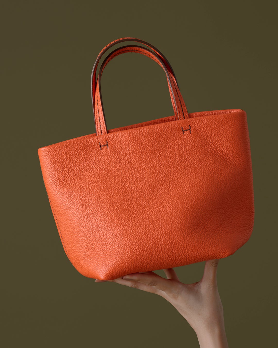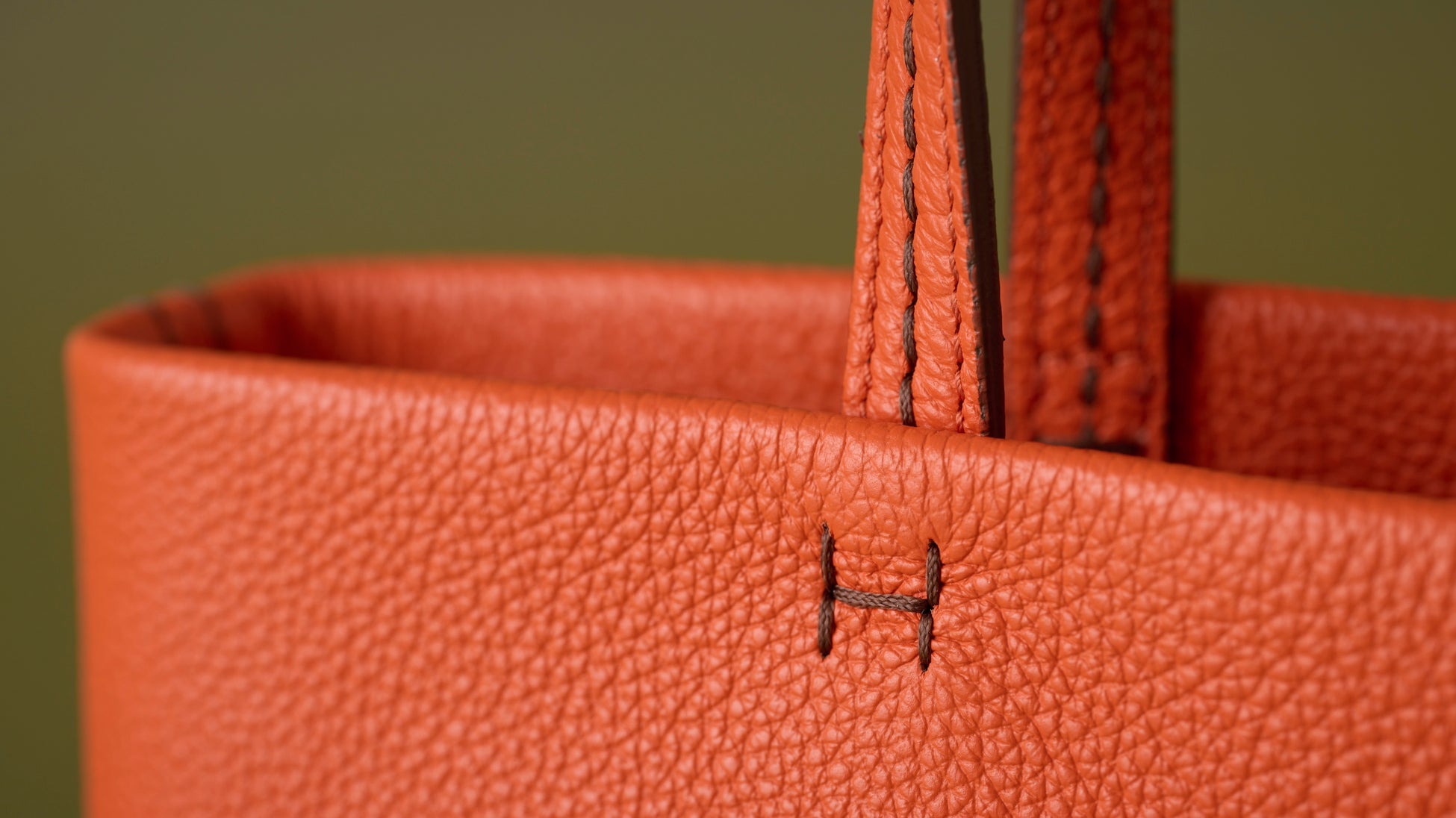 ハンドルやボディにあしらわれたステッチは太めの糸でコンビカラーにすることで、デザインのポイントと機能性を両立しています。 口元は革の断面やステッチを表に出さずへり返しをすることで、上品かつソフトな印象を演出します。