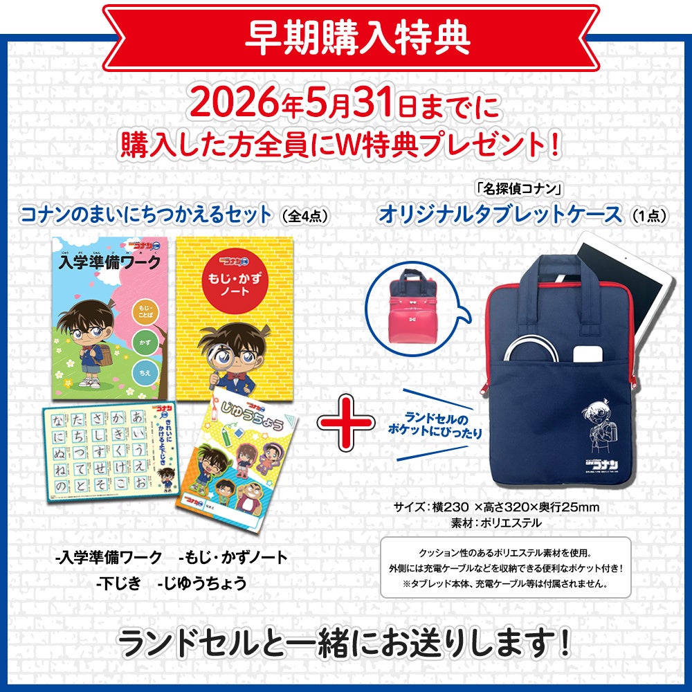 さらに、2026年1月23日~5月31日の期間中にご注文いただいた方には早期購入特典として、上記「オリジナルタブレットケース」に加え、入学準備に役立つワークブックや自由帳など、全4アイテムをセットにした「コナンのまいにちつかえるセット」を同梱してお届けします。