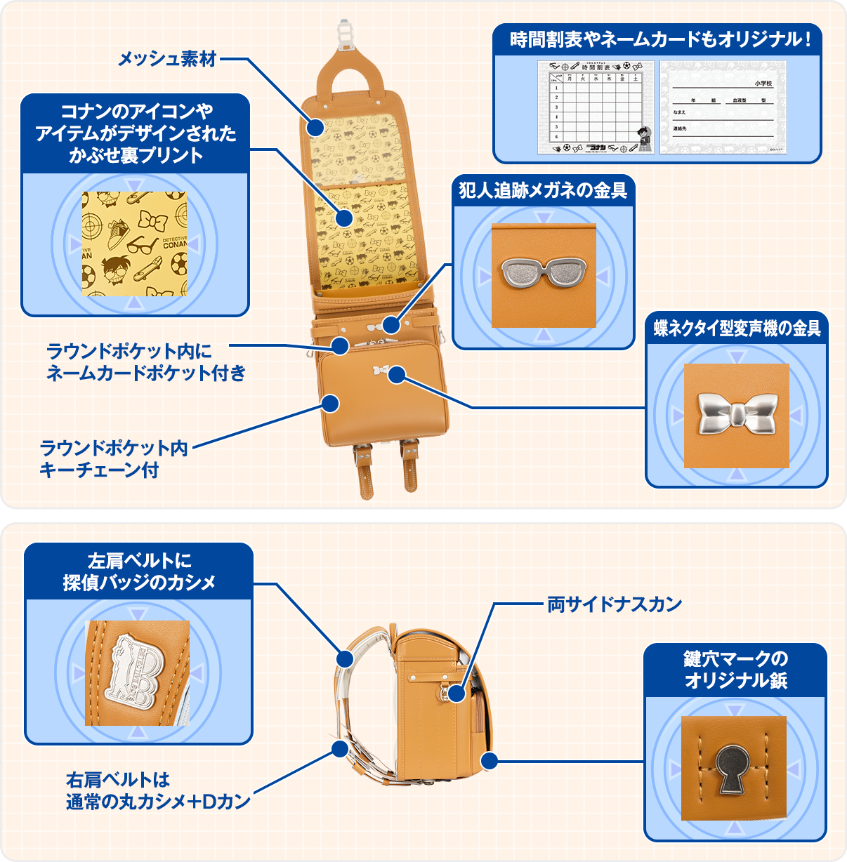 『名探偵コナン』のモチーフを随所にちりばめながら、通学に必要な機能性を備えています。