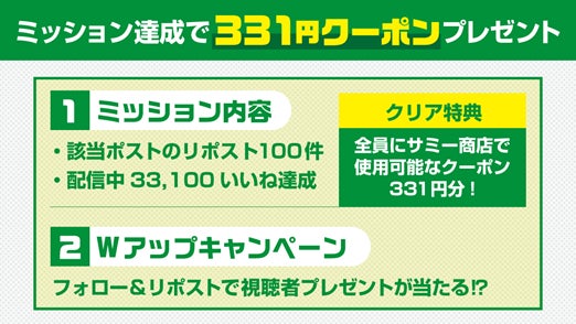 また配信内では、ミッションを達成するとサミー商店オンライン内で使えるクーポンや視聴者プレゼントをゲットするチャンスもございます。