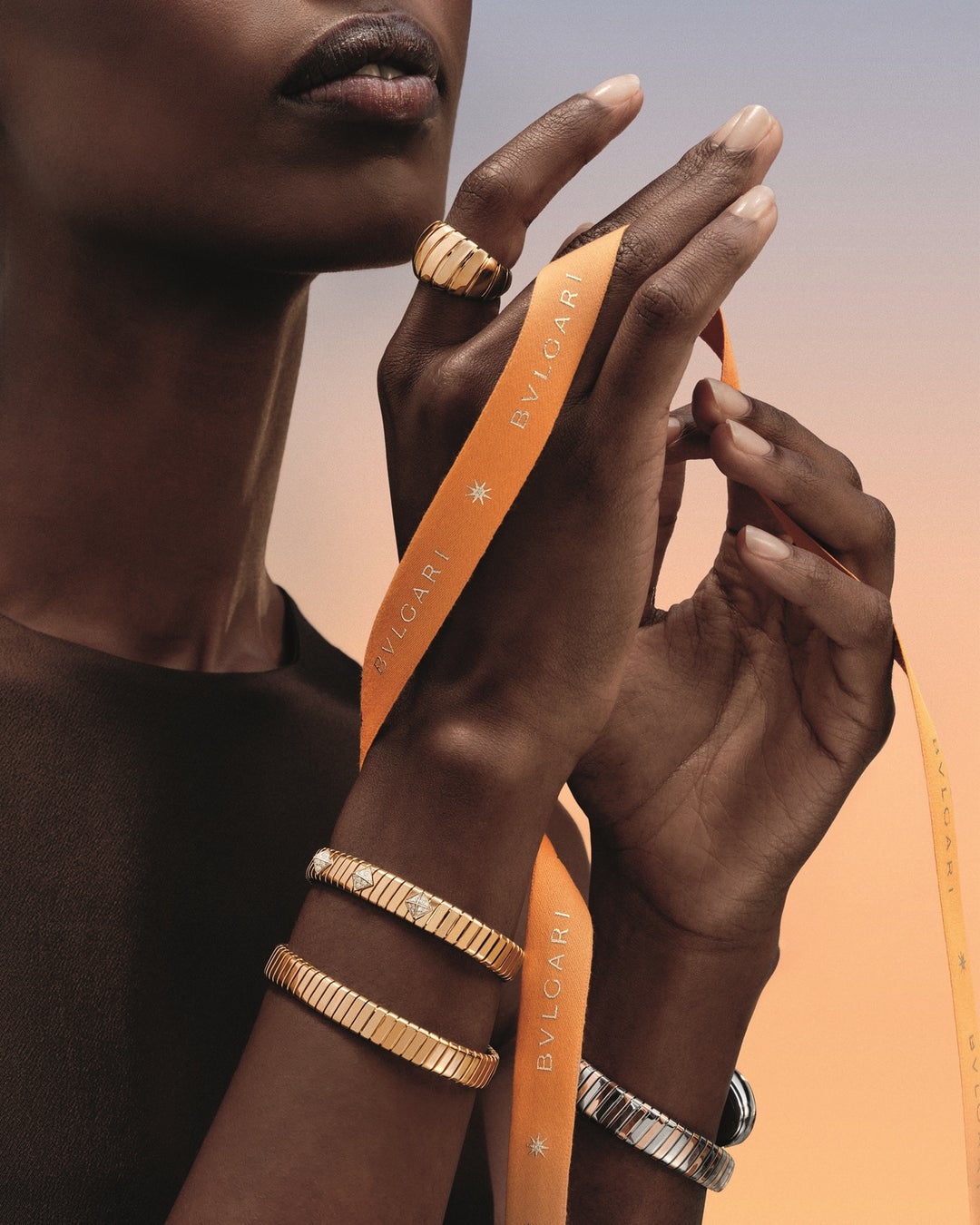 「ブルガリ トゥボガス」コレクションの世界観を広げる新作リングには、彫刻的で丸みを帯びたフォルムにダイヤモンドのパヴェがあしわれています。コレクションの特徴である柔軟な美学は、イエローゴールドのクラシックなトゥボガス ブレスレットにも継承されています。ひとつはメゾンのアーカイブから引き継がれたシグネチャーモチーフであるパレンテシのエレメントがエッジにパヴェセットであしらわれています。そしてもうひとつはダイヤモンドスタッドがアクセントとしてちりばめられ、いずれも伝統に根ざしたブルガリの革新への卓越した技量を映し出しています。