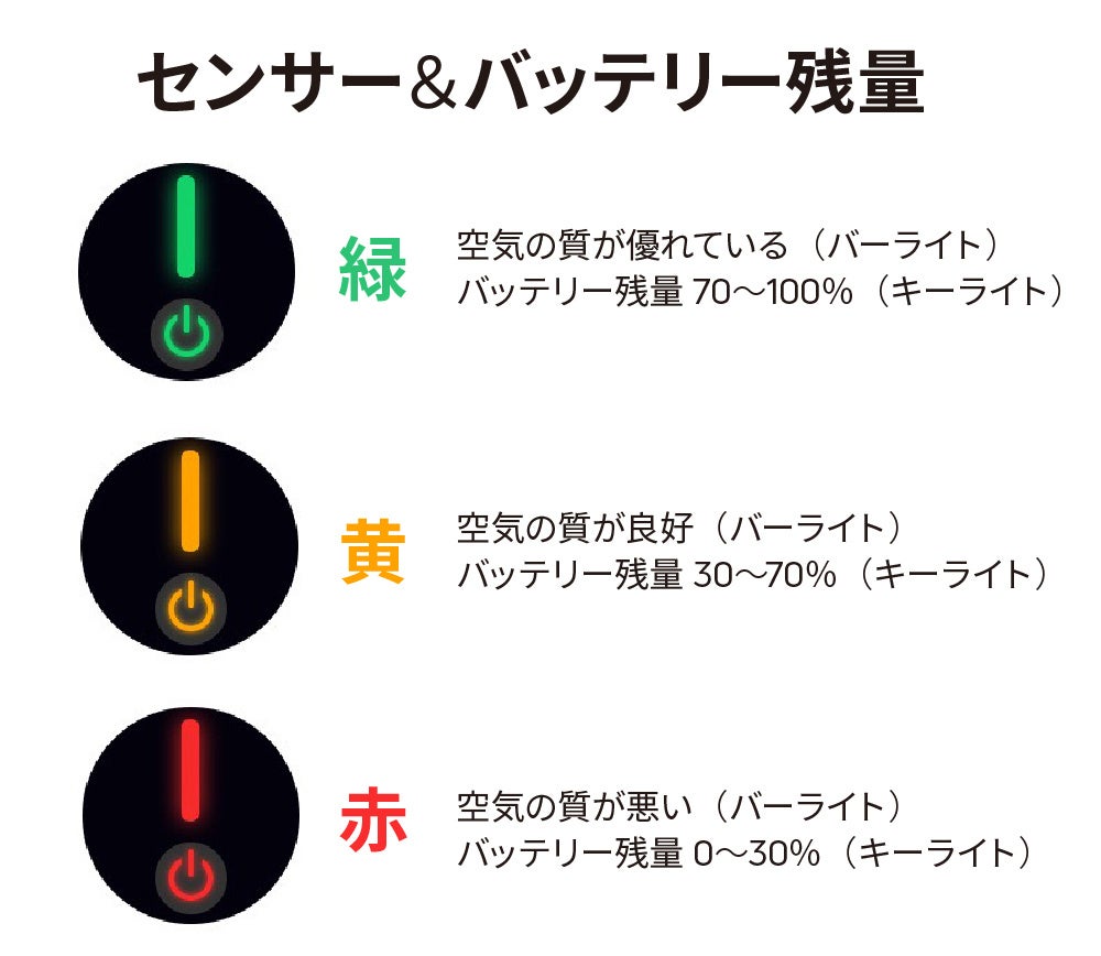 赤色:空気の質が悪い/バッテリー残量0~30%