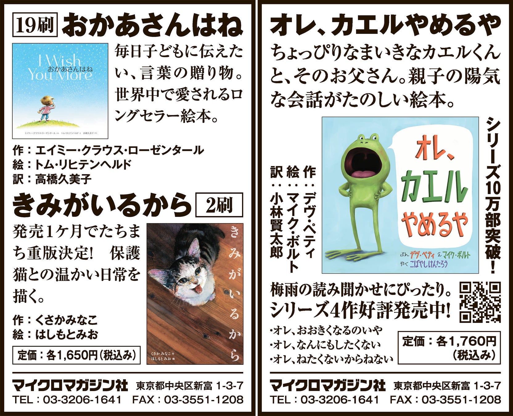 マイクロマガジン社(東京都中央区)は、『おかあさんはね』『きみがいるから』、『オレ、カエルやめるや』シリーズを6月2日の朝日新聞に掲載いたしました。