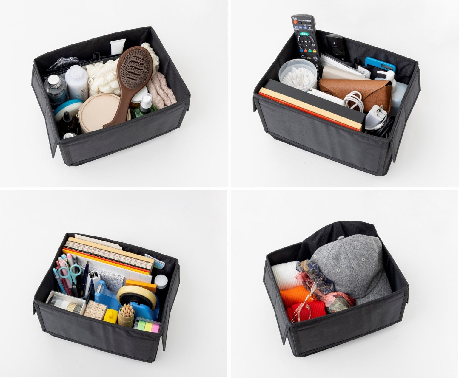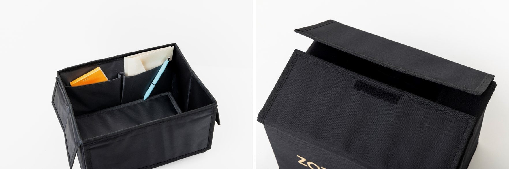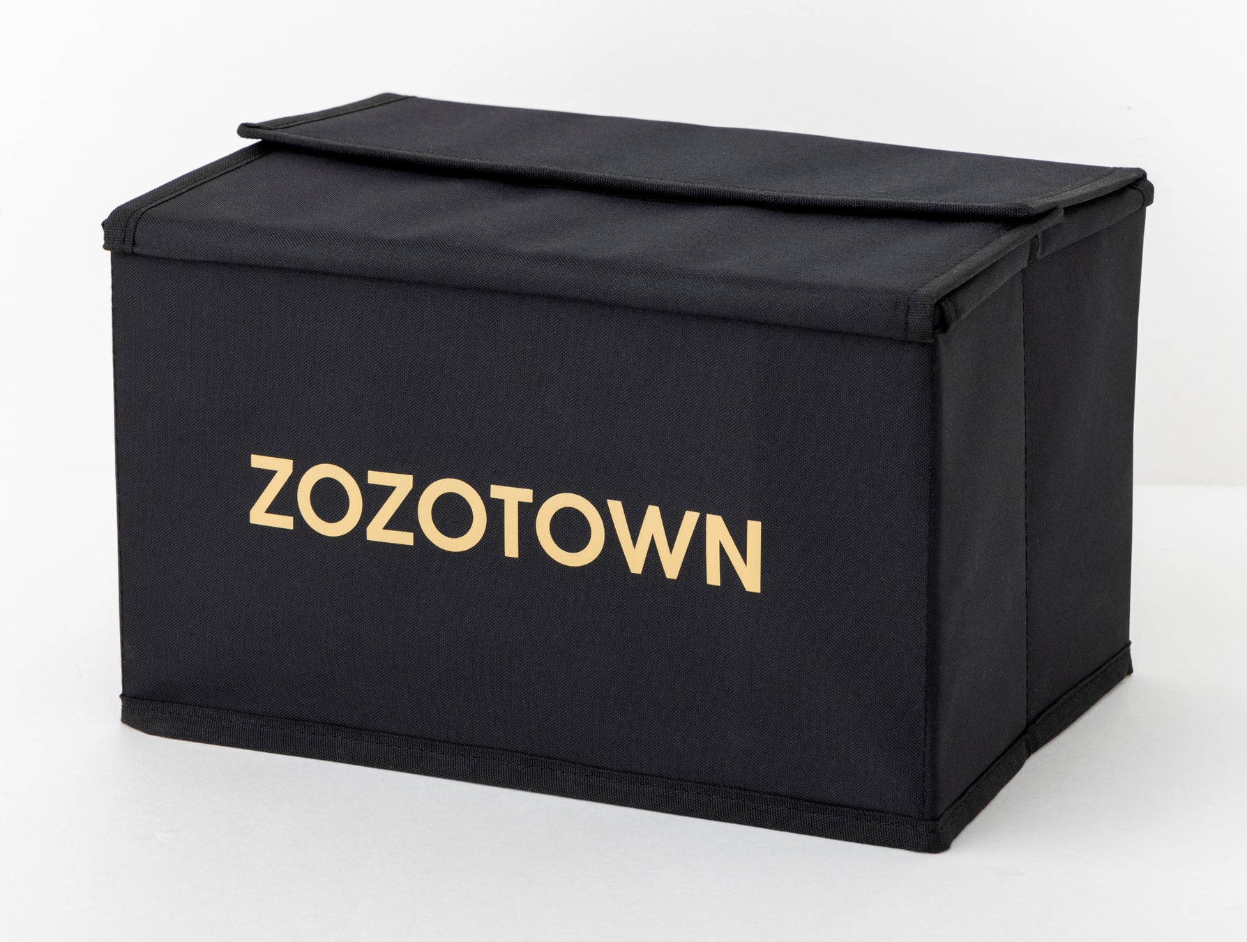 スペシャルアイテムは、「ZOZOTOWN」の象徴的なアイテムである黒い配送箱、通称“ZOZO箱”にそっくりな段ボール風ボックス。シックな印象のブラックボディに「ZOZOTOWN」ロゴをゴールドカラーでプリントした、スタイリッシュなデザインが魅力的。内ポケットを2つ備え、収納ボックスとしての使用はもちろん、インテリアとして置くのもおすすめです。コンパクトに折りたたむこともできるので、使わないときは省スペースで保管可能。リモコンやケーブルなどを入れてリビングに置いたり、化粧品を入れてコスメボックスとして使ったり、文房具やファッション小物を入れたり、幅広く活用できます。