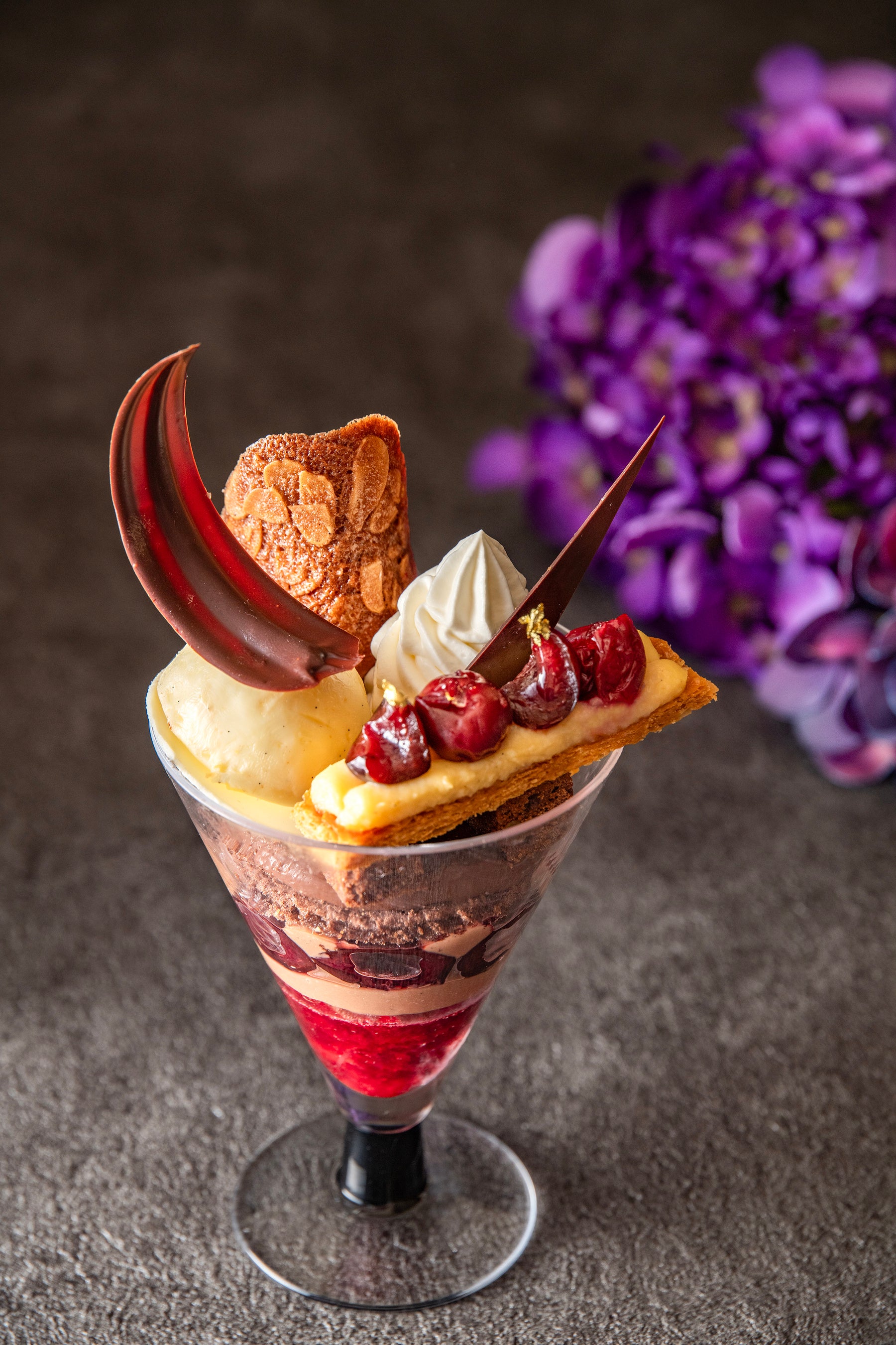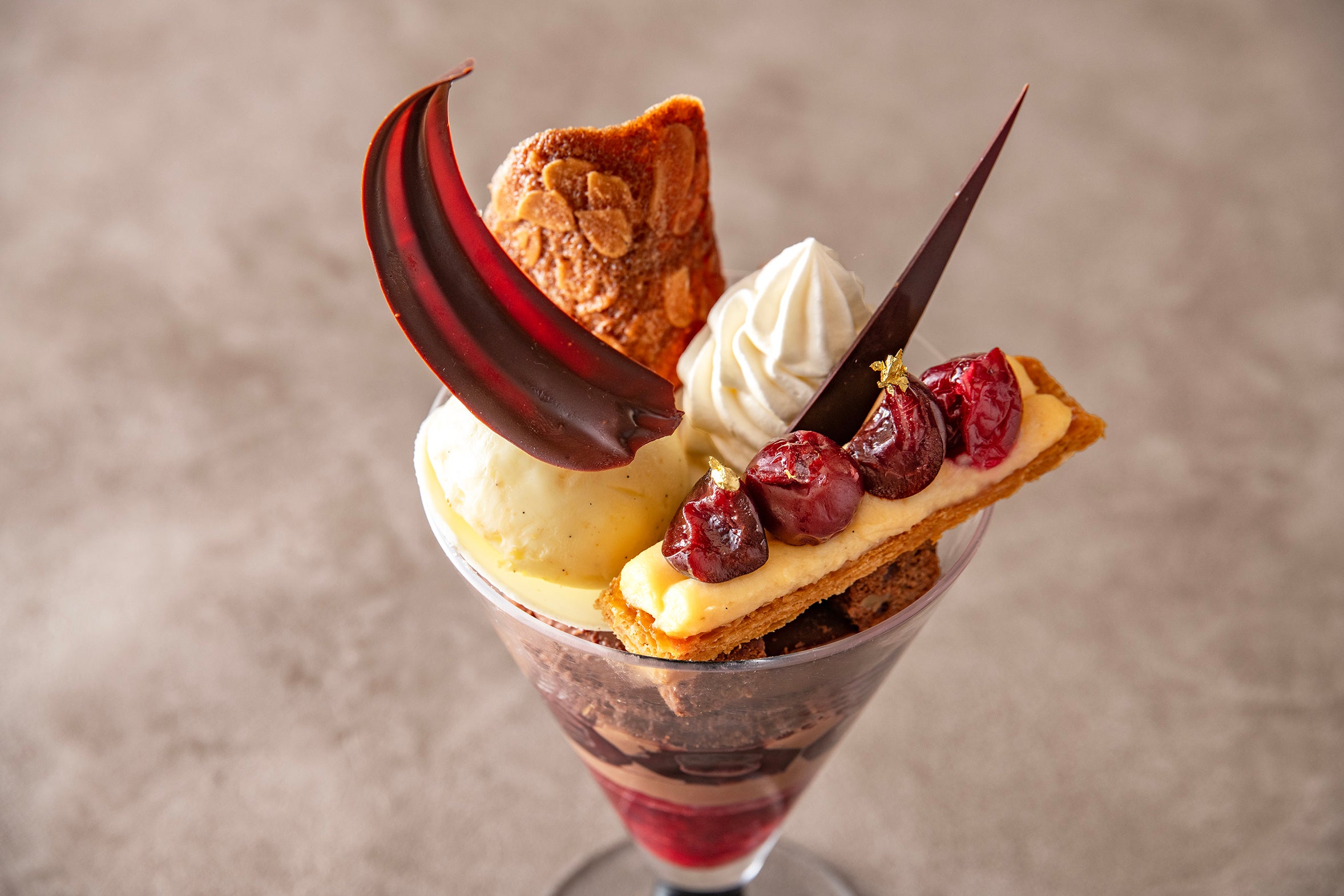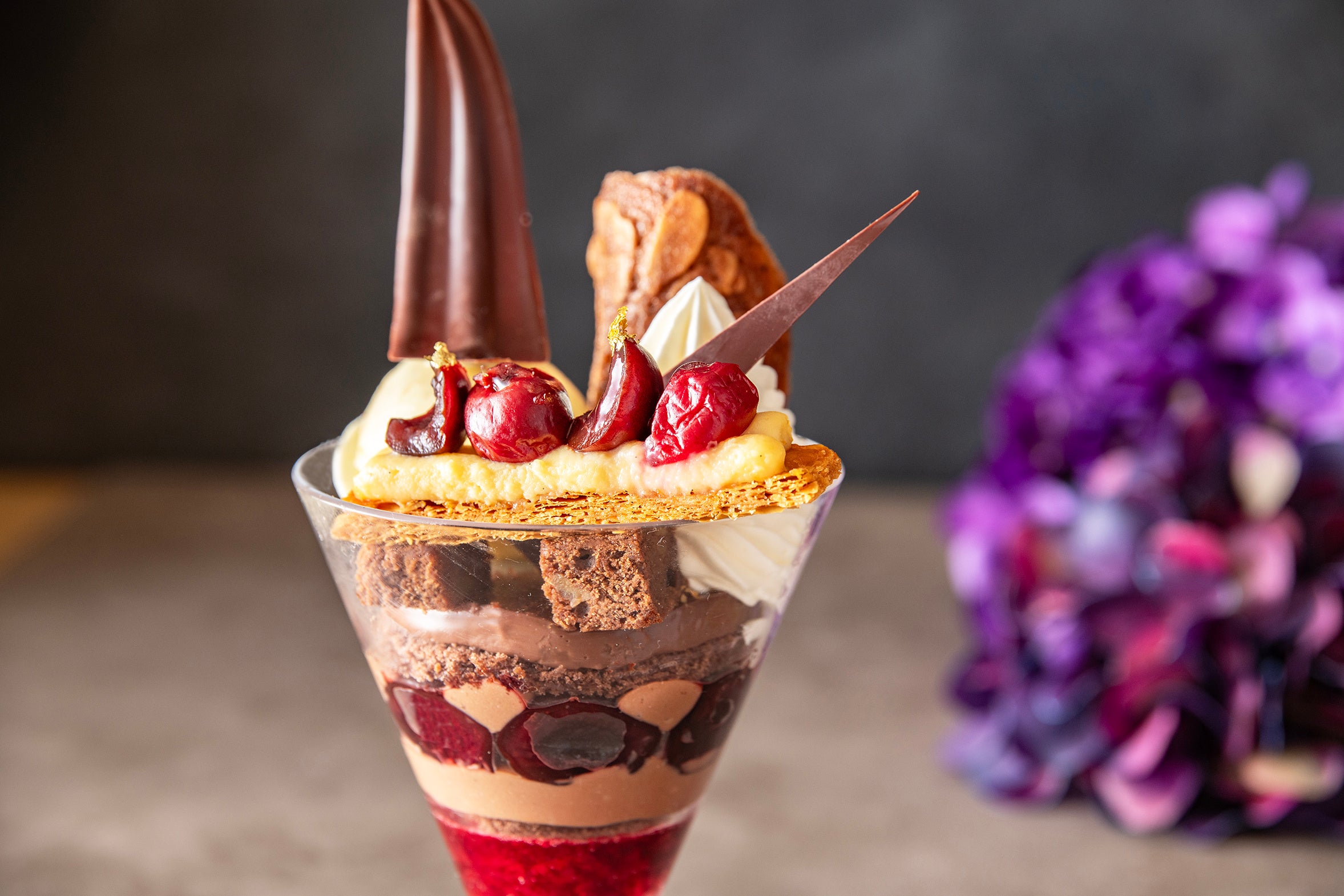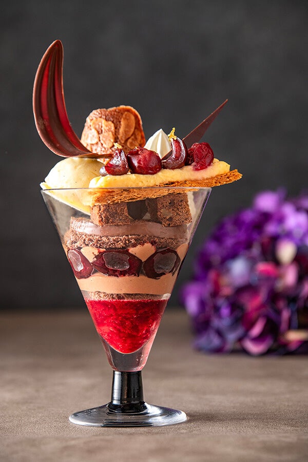 カカオの香りとビター感が広がるチョコレートに、酸味と爽やかなサワーチェリーが加わり、全体に深みと華やかさを与えます。初夏の爽やかなひとときにぴったりな、極上のパフェです。