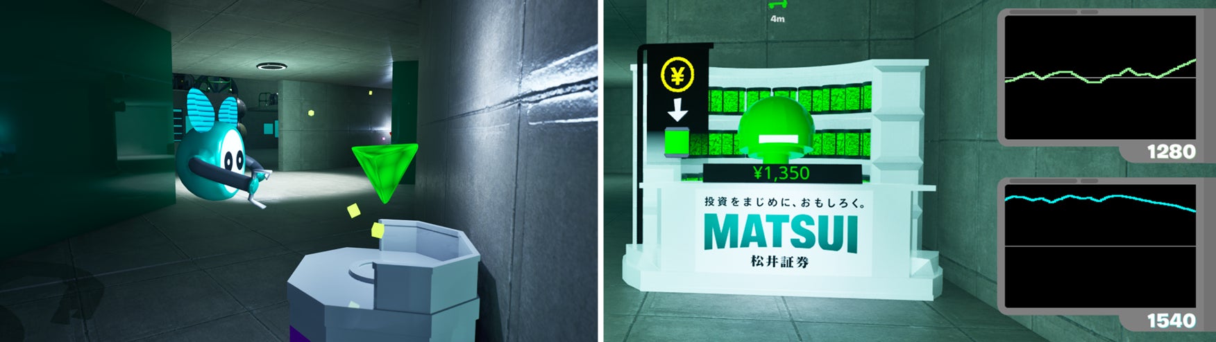 ダンジョン内で見つけたアイテムは、ダンジョン探索の相棒となるドローンロボットで回収していきます。回収したアイテムは自動的にゲーム内マネーに変換され、そのマネーを元に価格変動する「カブー」を売買していきます。
