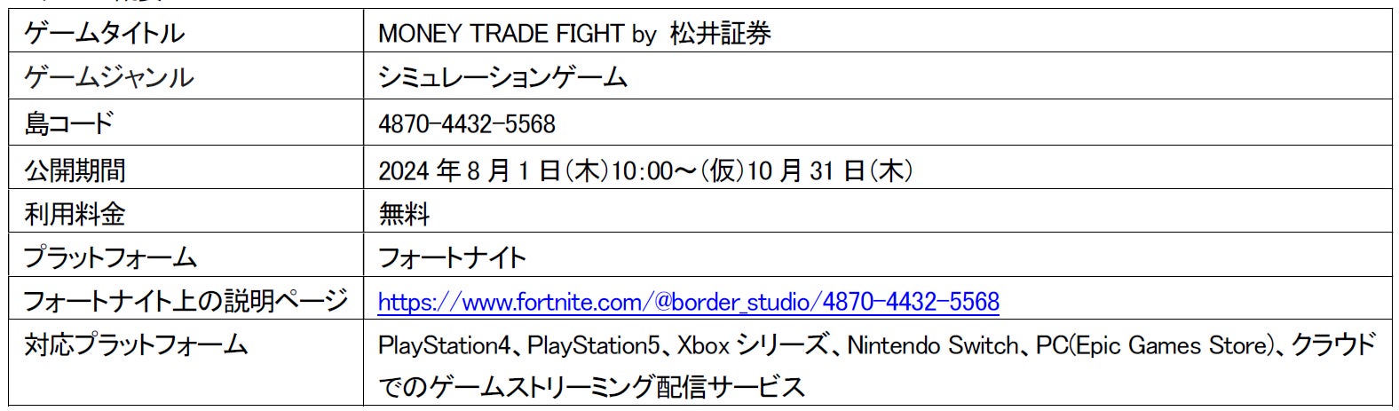当ゲームの詳細は下記のページをご覧ください。https://www.matsui.co.jp/event/fortnite-01