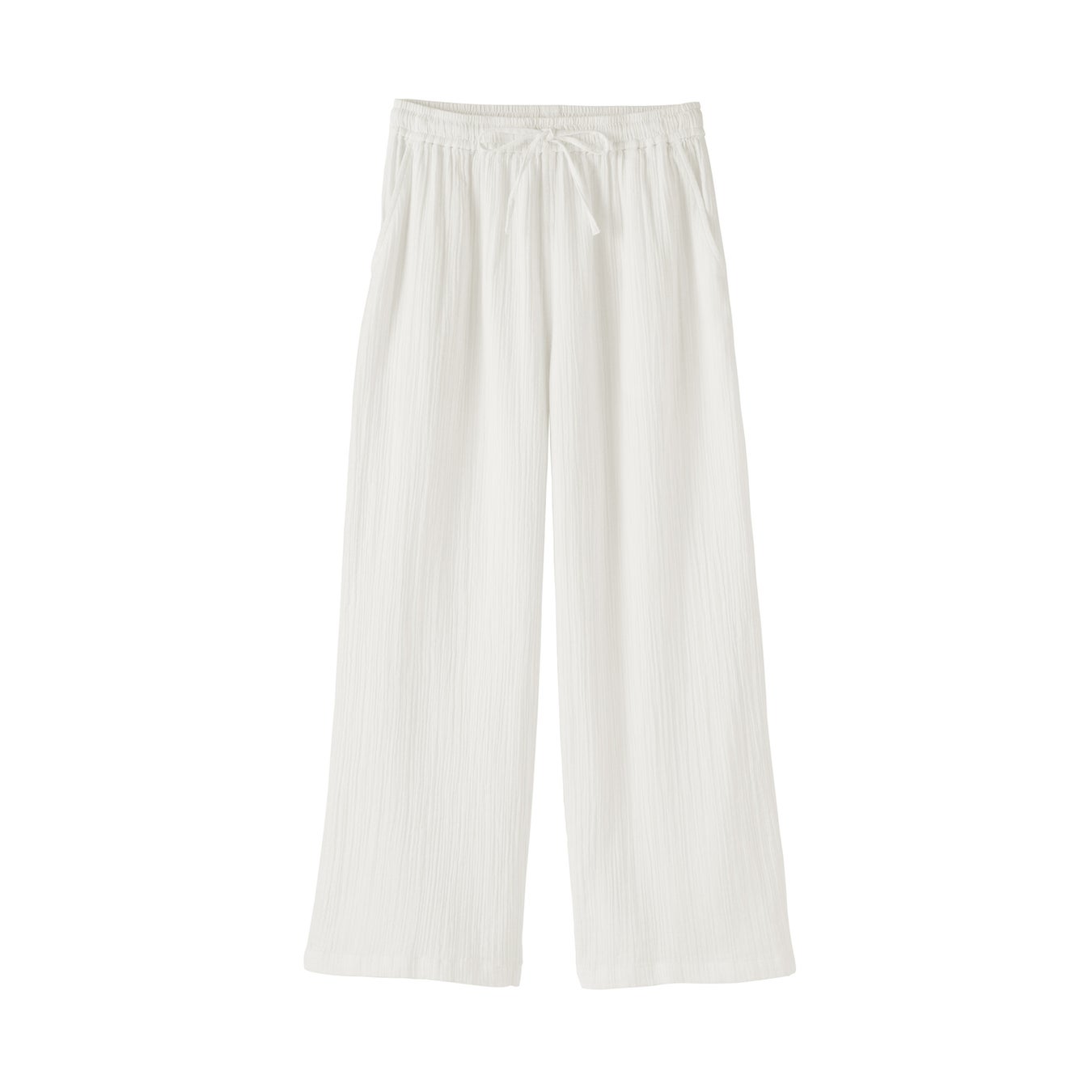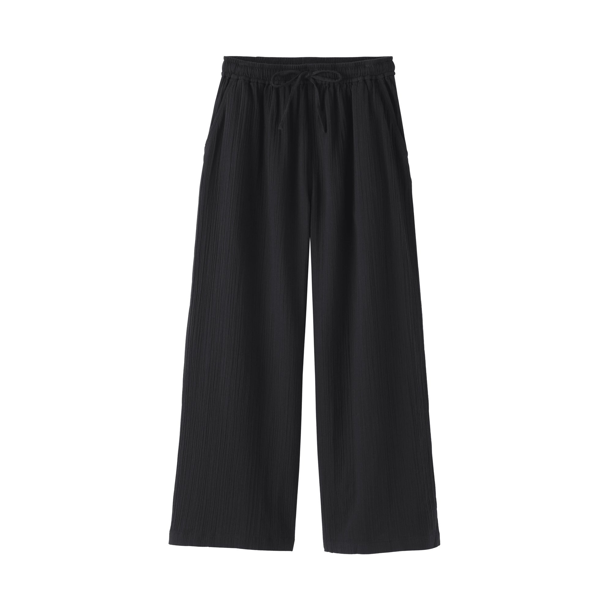 やわらかなガーゼ素材のワイドパンツです。風通しもよく暑い時期に快適に過ごせます。内側のゴム調整口からゴムを引き出し、ご自身で縫い止めていただくことでウエストの調整が可能です。「楊柳ガーゼフリルスリーブブラウス」とセットアップのコーディネートができます。