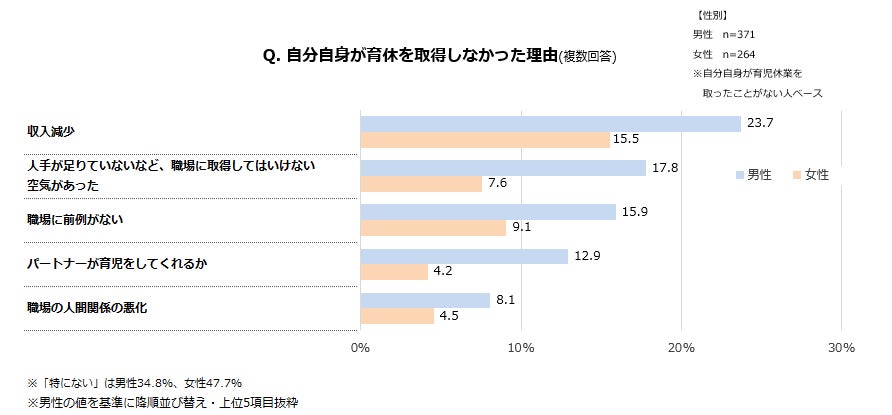 パートナーの育休の取得日数について、女性回答ではパートナーは育休を「利用したことがない」が65.0%。取得した人は「5日以内」が最も多い結果に。男性が育休を取らなかった理由では「収入減少」「人手不足」「前例がない」が女性を上回り、男性育休の取得ハードルの高さを感じさせる【図1、図2】