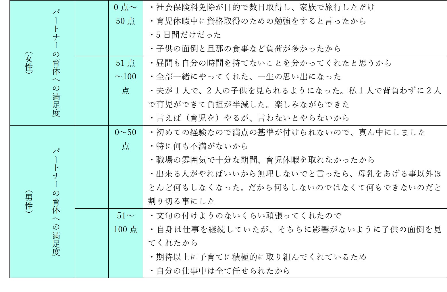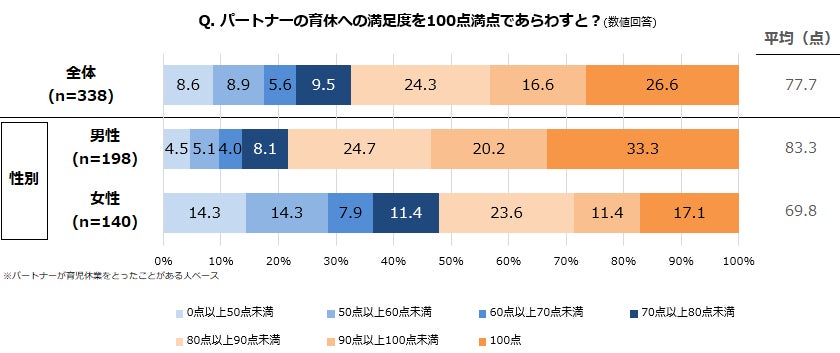 パートナーの育休への満足度を100点満点で表すと、男性は平均83.3点、女性は平均69.8点で男性回答が大きく上回った。点数の理由については、「1人で背負わずに2人で育児ができた」「一生の思い出になった」というポジティブな意見がある一方で、「育休中に資格取得のための勉強をすると言ったから」「言えば(育児を)やるが、言わないとやらないから」など、育児に対する温度差を感じさせる回答も見られた。【図5、6】
