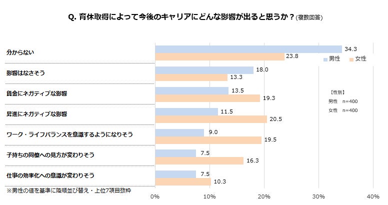 育休取得によるキャリアの影響は、男女ともに1位は「分からない」(男性:34.3%、女性:23.8%)となった。男性は「分からない(34.3%)」「影響はなさそう(18.0%)」を合わせると半数を超えた。これは、男性育休の事例の少なさから影響が予測しづらい点や、現状の取得日数が数日に留まる人が多いことが理由として考えられる。
