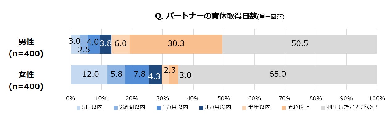 小学生未満の子供を持つ正社員の男女に、自身のパートナーの育休取得日数を聞いたところ、女性回答では「(パートナーは育休を)利用したことがない」が65.0%となった。また、取得した人の日数を見ると「5日以内(12.0%)」が最多で、次いで「1カ月以内(7.8%)」「2週間以内(5.8%)」と短期間での取得が多く、長期育休取得へのハードルの高さがうかがえる。