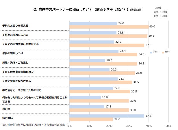 育休中のパートナーに期待することでは、男性は「特にない」が37.8%で、2位の「子供の寝かしつけ」が24.8%だった。対して女性は、「子供のおむつを替える(40.0%)」「子供をお風呂に入れる(39.3%)」など、3割を超える回答が多く、パートナーが育休中に家事育児へ参加することを強く求めていることが分かる。また女性は、「子育ての苦労や喜びを共有する(37.8%)」「子育ての当事者意識を持つ(33.0%)」など、気持ちの寄り添いを求めているのも特徴的で、男女間の育休に対する意識の差がうかがえる。【図4】
