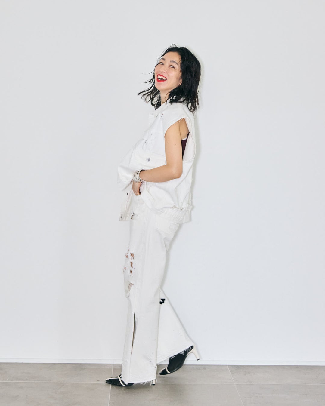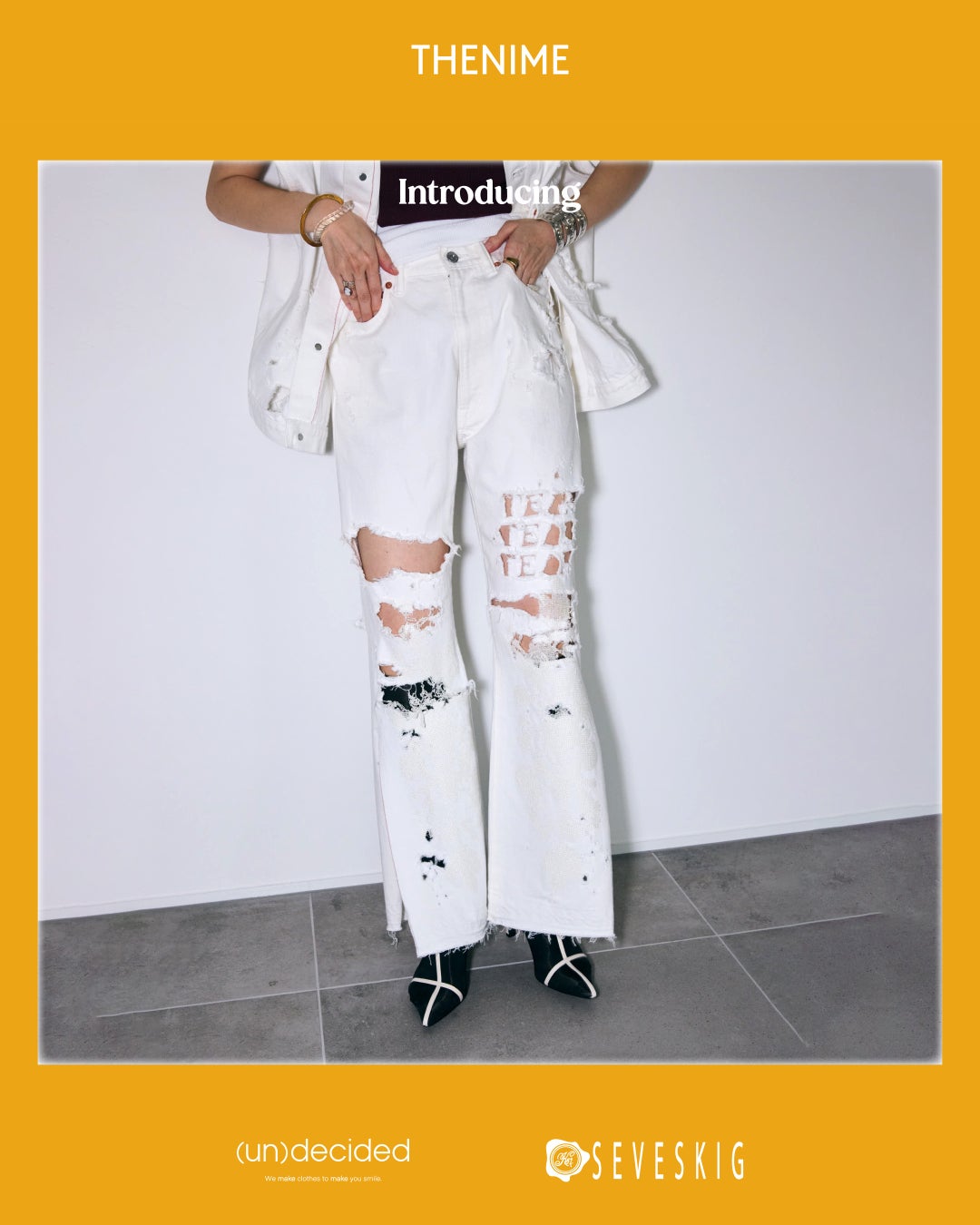 701をベースとし、縫製糸使いなども忠実に再現した5ポケットデニムパンツ。股上が深く、ヒップにかけて丸みがある女性らしいシルエット。加工後最終工程でスリット仕様に。SEVESKIG 同様、(un)decided 2024SSのシーズンテーマ「IF WE BREAK DOWN THE WALLS」(もし人と人、国と国の間に壁が無ければ)のタイポグラフィをレーザー加工でダメージとして入れています。ダメージ加工後に、穴の上から刺繍でリペアする特殊なクロスステッチ刺繍を施しています。DENIM JACKETと同様に、東スラブ伝統の花、10種類(※)をAIに生成してもらい、それをクロスステッチデータに置き換え、グラデーション糸で刺繍。今回のコラボレーションでは、丈感のバランスを修正し、裾を解く加工をプラスしています。