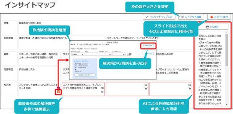 顧客の経営方針やビジネス環境などから、どのようなプロジェクトが顧客にとって必要なのかを押さえ、プロジェクトと自社商品をセットで顧客へ提案するための戦略を検討。Industry Cloud版※2ではスライド出力機能で検討結果を提案資料へ組み込むことも可能。