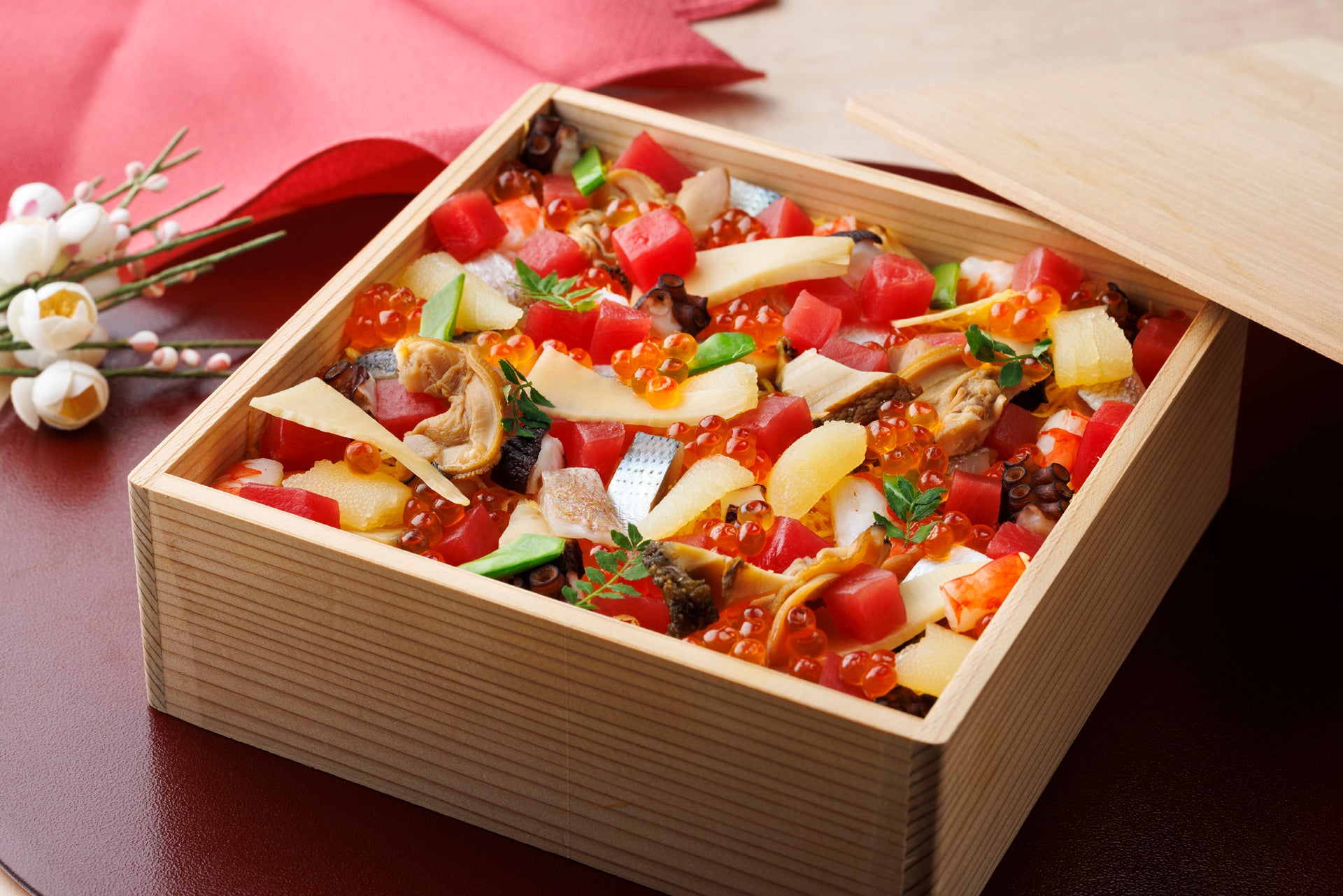 さえき自慢の天然本鮪をはじめ、鮑や車海老、いくらなどの具材を贅沢に盛り込み、折箱に詰めてご用意しました。お子様の成長を願う桃の節句やお祝いのお席にご利用ください。15箱限定となりますので、お早めのご予約がおすすめです。