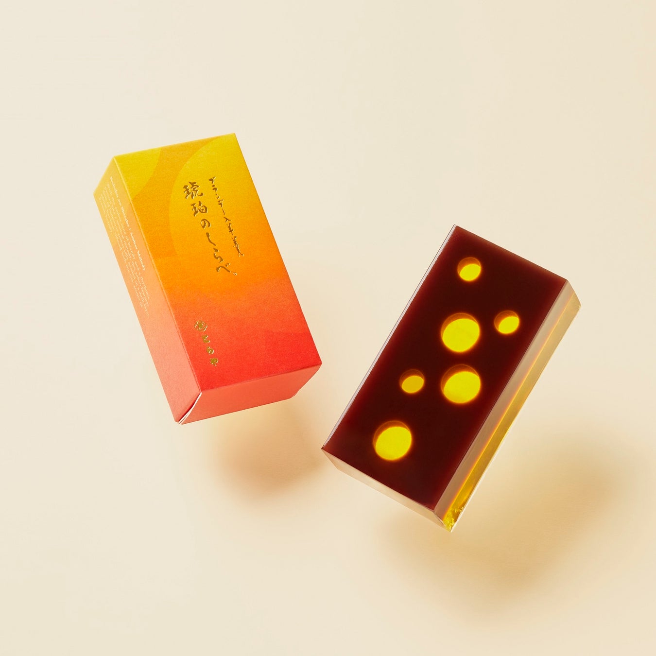 芳醇な香りのフランス産のブランデーを使用した煉羊羹を丸く抜き、琥珀羹と重ね合わせました。