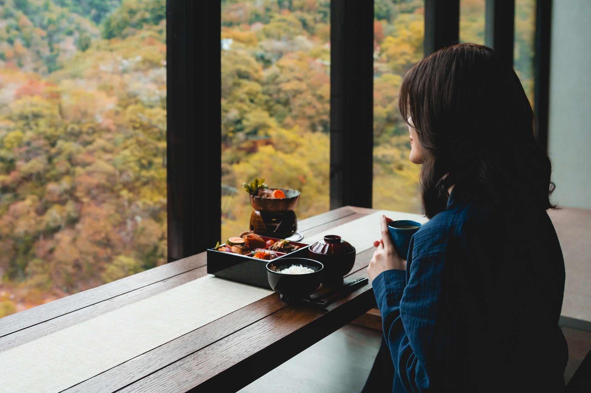 冬の静かな朝、山々を望む客室で蒔絵の器を使った特別な朝食を提供します。旬の食材を使い、自然の味を生かして丁寧に仕上げた料理です。器には蒔絵の漆器を用い、光沢や色合い、線の美しさが料理と調和します。伝統工芸と現代料理がひとつになり、朝霧に包まれた山の風景とともに、味覚と心を落ち着ける穏やかな時間を過ごすことができます。