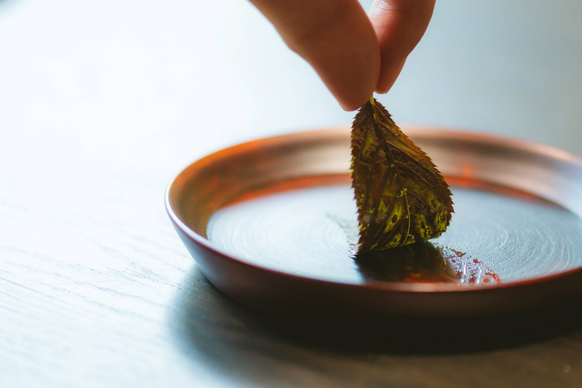 「蒔絵」とは「粉をまく絵」という意味で、日本の漆芸で広く使われてきた代表的な技法の一つです。金粉などを使って模様を描くため、高い技術と時間が必要です。長い年月をかけて発展し、今では芸術や装飾の分野でも高く評価されています*2 。本プランでは、館内のウォーターガーデンに自生する刺蔥(ツーツォン)や青楓の葉に天然漆を塗り、器の表面に押し当てて模様を写し取り、金粉を加えてオリジナル作品を作ります。