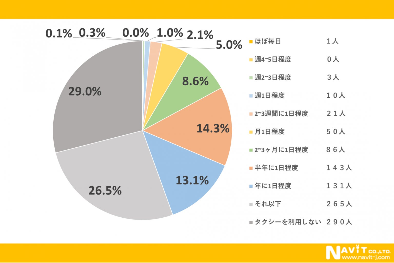 続いては、タクシーを利用する頻度についてたずねたアンケートです。1番多かったのは「半年に1日程度」という人で14.3%でした。次に多かったのが「年に1日程度」で13.1%という結果になりました。