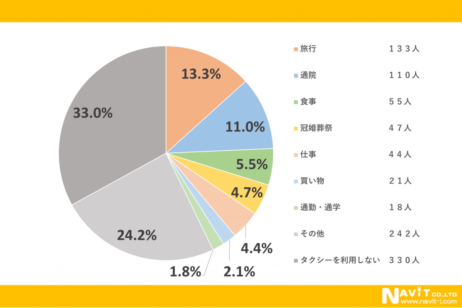タクシーの利用目的についてのアンケートです。利用目的で1番多かったのが「旅行」で13.3%です。空港や駅までの利用でしょうか。大きな荷物を持っての移動は大変ですからね。