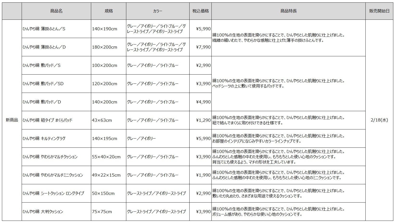 また、くつろぎの時間に心地よく使用できるインテリア用品として、「ひんやり綿 キルティングラグ」、もちもちとした使い心地の「ひんやり綿 やわらかマルチクッション」「ひんやり綿 やわらかマルチミニクッション」に加え、「ひんやり綿 シートクッション ロングタイプ」「ひんやり綿 大判クッション」など、計12種を取り揃えました。