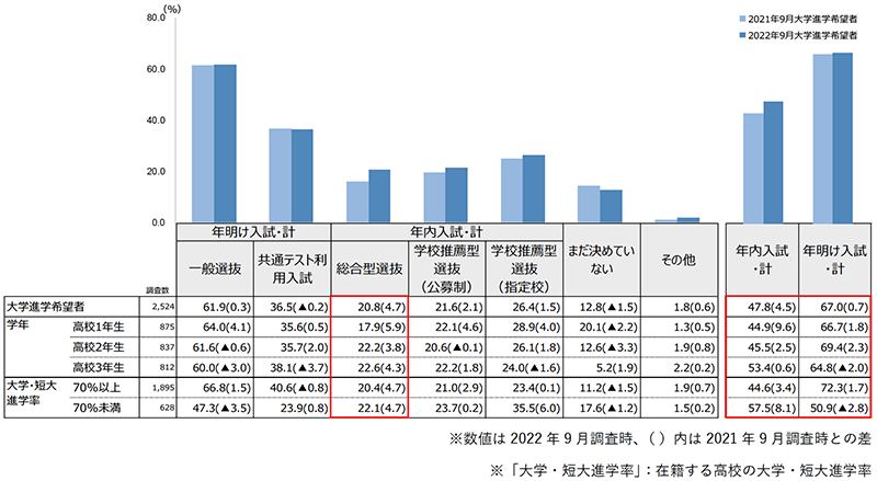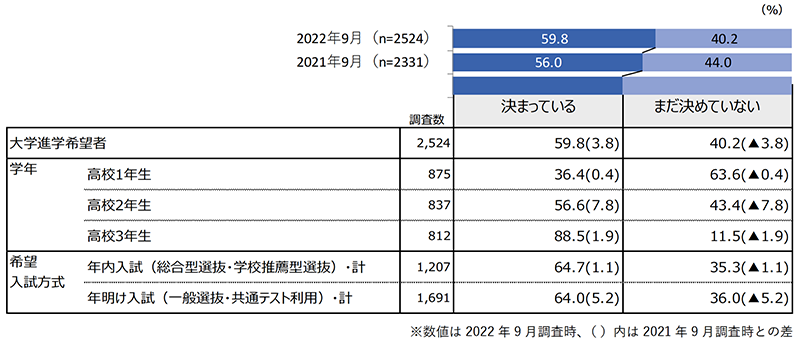 ・前年比増加率で見ると、高校2年で7.8pt増えて半数超えの56.6%。年明け入試検討者は+5.2ptで64.0%と、年内入試の決定率とほぼ同水準となった。年内入試と年明け入試併願層も増加傾向である(参照;「コロナ禍における進路選択行動影響調査2022年3月」)ことからも、入試方式にかかわらず「第1志望校決定」はさらなる早期化の様相を呈している。