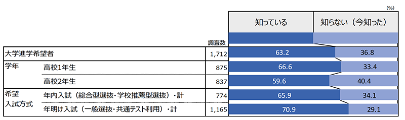 ・希望入試方式別に見ると、年明け入試希望層の方が年内入試希望層より高く70.9%が認知。