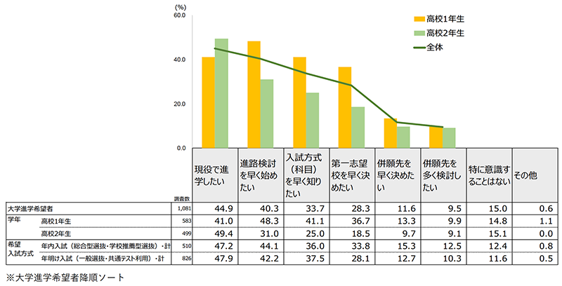 ◆2年生は「現役で進学したい」が約半数を占め、新課程対応入試を避けたい意向。一方、新課程対応入試初年度となる1年生は「進路検討を早く始めたい」「入試方式を早く知りたい」と、早期公表への要望が高い。