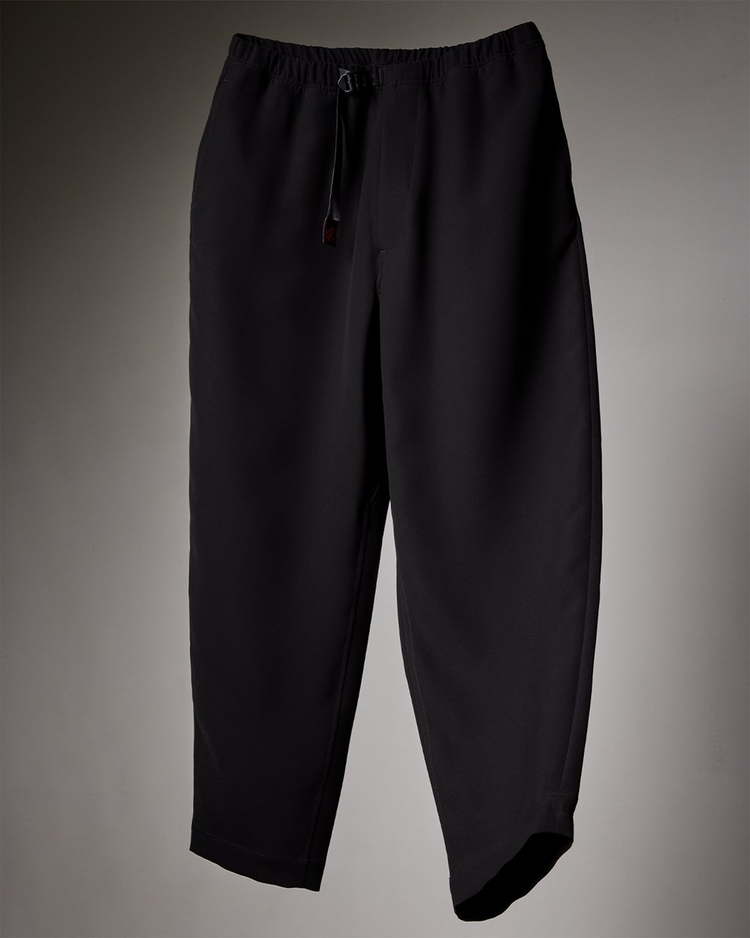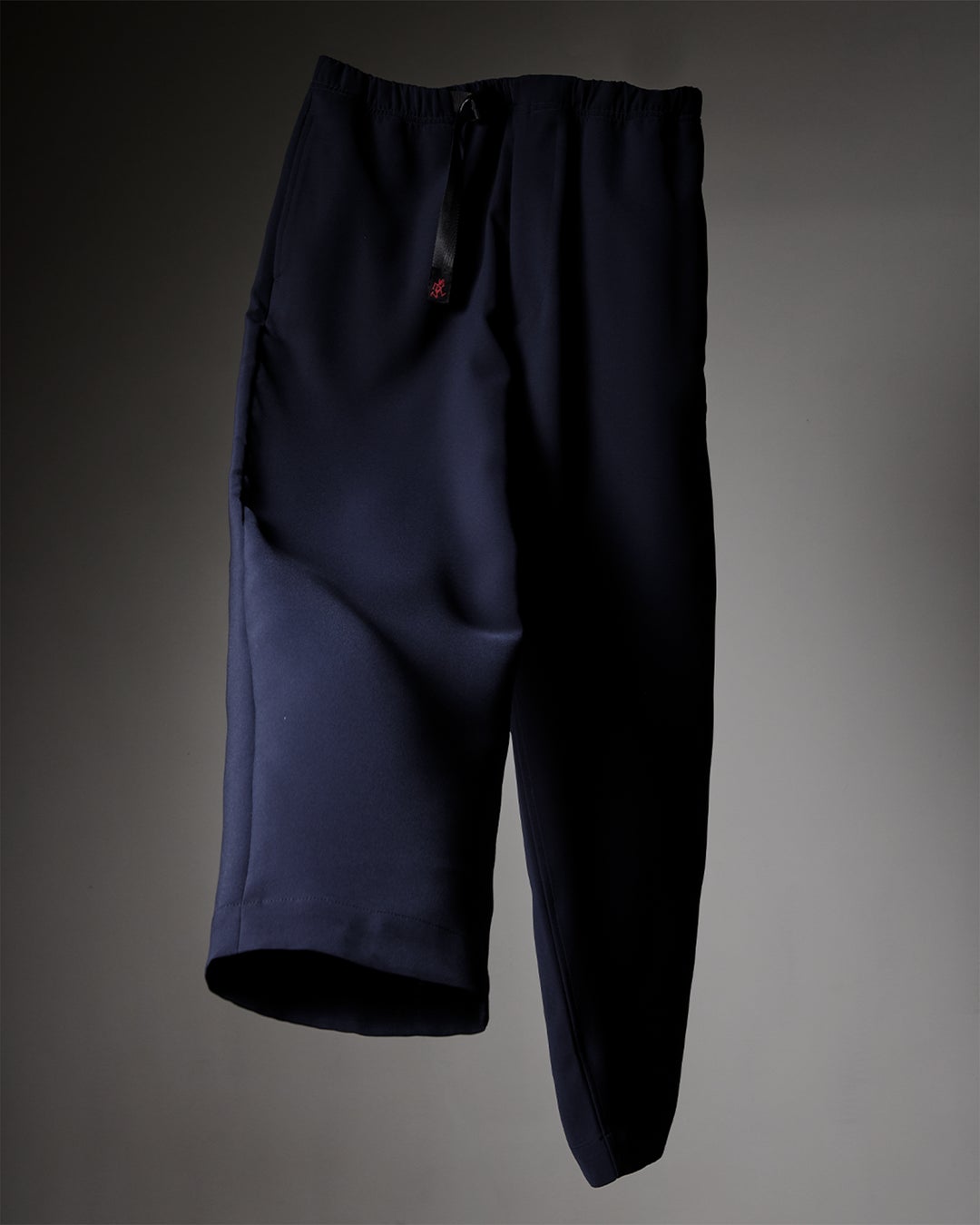 素材はシャリ感のある風合いと程よいドレープ感を併せ持つ、上品な印象のダブルクロスを使用し、GRAMICCIの特徴である、自由な開脚が可能な”ガゼットクロッチ”、片手でウエストを調整が出来る、”ウエイビングベルト”。