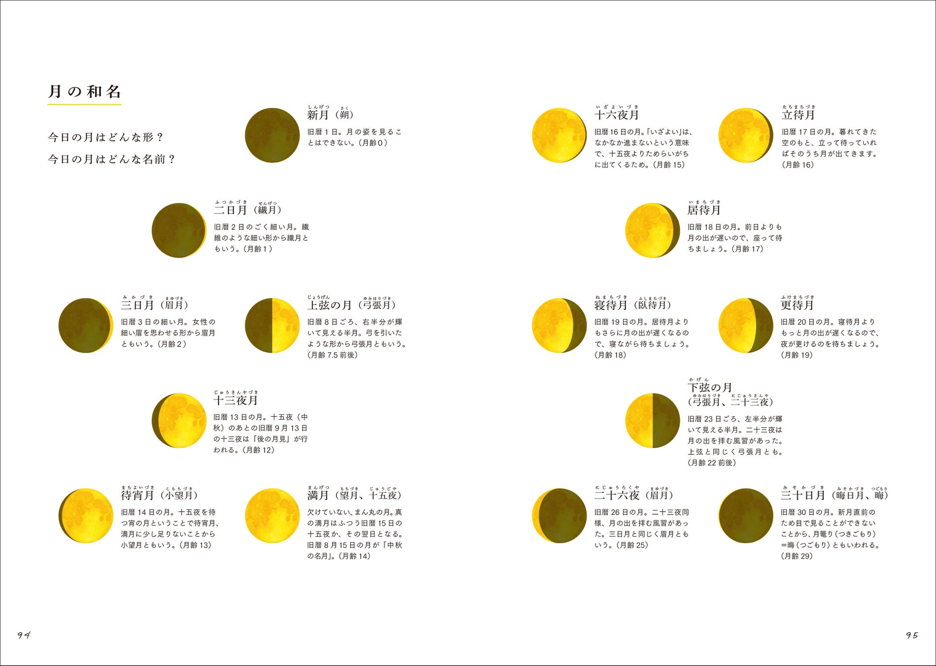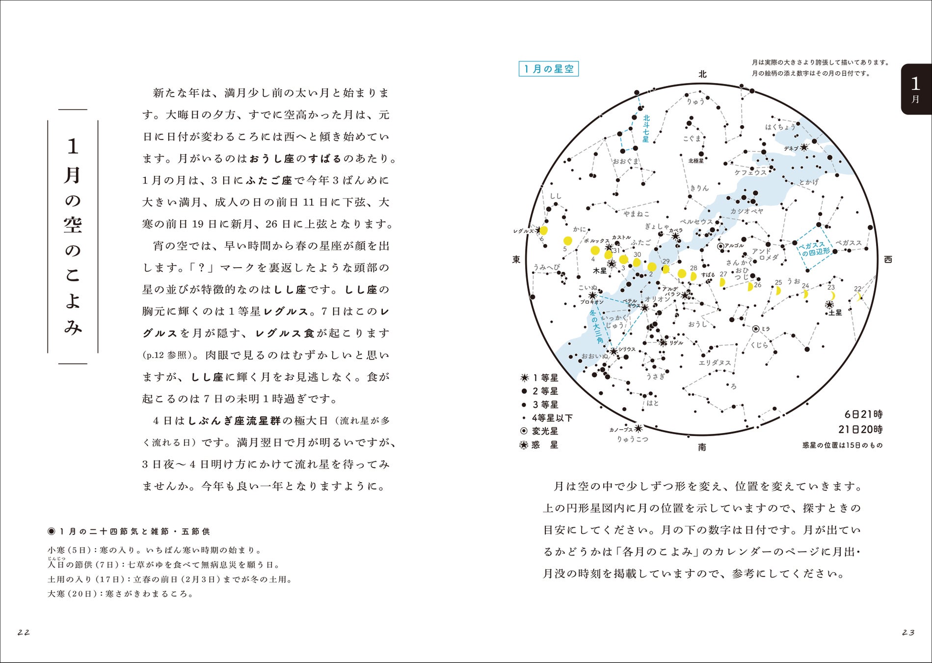 この本には、2026年の毎日の月の満ち欠け、月の呼び名、旧暦、二十四節気、スーパームーンや月食などの情報に加え、毎日の月の出没時刻、毎月の星空(星座)、流れ星が多く見られる日など、役に立つ情報が満載です。
