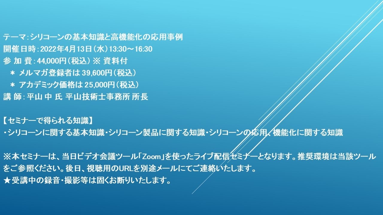 先端技術情報や市場情報を提供している(株)シーエムシー・リサーチ(千代田区神田錦町: https://cmcre.com/ )では、 各種材料・化学品などの市場動向・技術動向のセミナーや書籍発行を行っておりますが、 このたび「シリコーンの基本知識と高機能化の応用事例」と題するセミナーを、 講師に平山 中 氏 平山技術士事務所 所長)をお迎えし、2022年4月13日(水)13:30より、 ZOOMを利用したライブ配信で開催いたします。 受講料は、 一般:44,000円(税込)、 弊社メルマガ会員:39,600円(税込)、 アカデミック価格は25,000円(税込)となっております(資料付)。