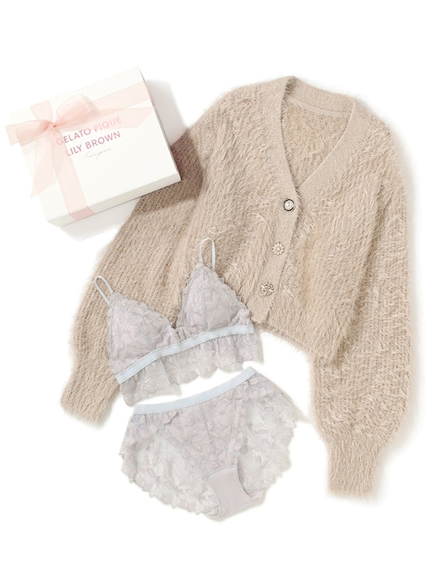 ポインセチア柄のブラレットと、ルームウェアブランド「gelato pique」で大人気のフェザーニットをLILY BROWNらしいヴィンテージライクなカラーリングとボタンでアレンジしたカーディガン。
