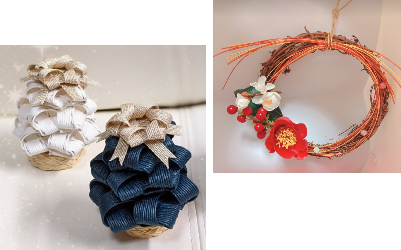 再生紙で作られたクラフトバンドを活用し、手乗りサイズのミニツリーやお正月飾りをお作りいただけます。年末年始を華やかに彩る、世界にひとつだけのオリジナルオーナメントとしてお持ち帰りください。