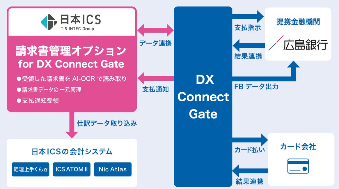今回の「請求書管理オプション for DX Connect Gate」の提供において、日本ICSは広島銀行と提携しており、決済処理や支払通知が連携されることで、これまで煩雑だった経理業務の大幅な効率化を実現します。