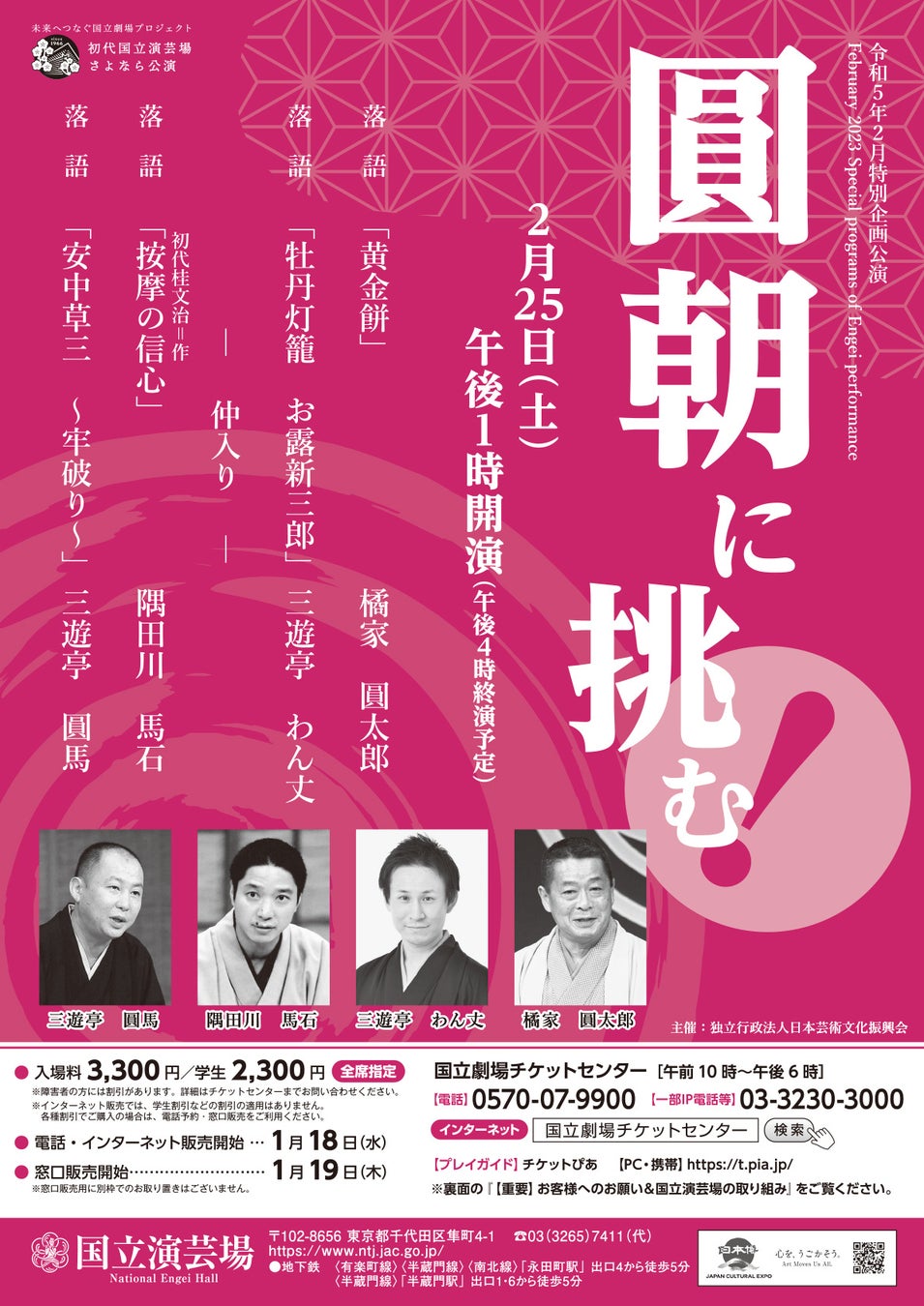未来へつなぐ国立劇場プロジェクト 初代国立演芸場さよなら公演『令和5年2月特別企画公演 圓朝に挑む!』が2022年2月25日(土)に国立演芸場(東京都千代田区隼町4-1)にて開催されます。チケットはカンフェティ(運営:ロングランプランニング株式会社、東京都新宿区、代表取締役:榑松 大剛)にて1月18日(水) 10:00よりチケット発売開始です。