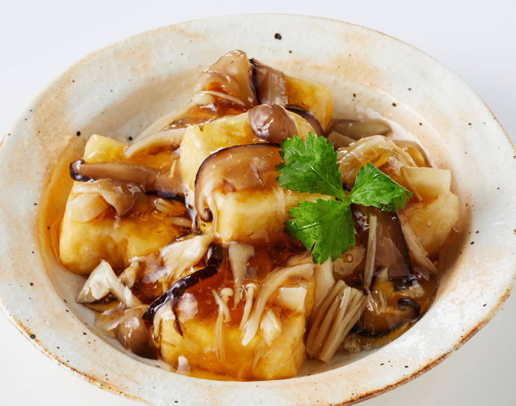「ひと口サイズの食べやすい揚げ豆腐に、上品なだしが香るきのこあんが満足度の高い一品です。」