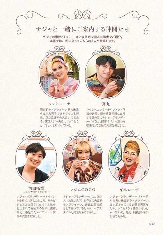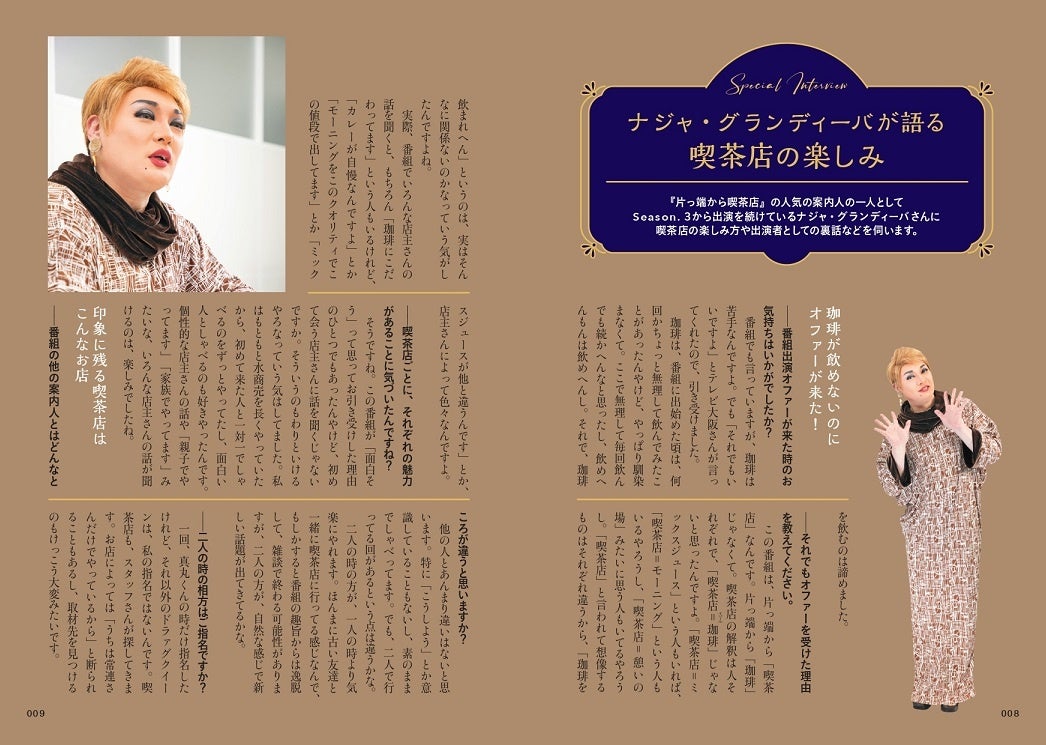 ナジャさんが一人で巡るだけでなく、ドラァグクイーン仲間や、お気に入りの若手俳優、アナウンサーと一緒に二人で案内する放送回もあり、その掛け合いも魅力のひとつ。ページをめくれば、番組の楽しい雰囲気が蘇ります。また番組で語られたトークから、印象的なものをピックアップした「名言集」コラムも必見です。本書のオリジナル企画としてナジャさんへのスペシャルインタビューも掲載しています。「実はコーヒーは苦手」と語るナジャさんならではの、喫茶店の楽しみ方の極意を聞きました。