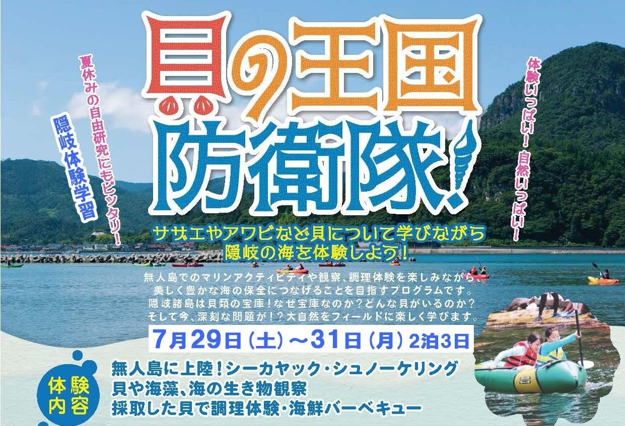 ”貝の王国”と言われる隠岐諸島で、参加した子どもたちが、「貝を育む海洋環境」や「貝と関わりの深い海藻」、「貝に忍び寄る問題」について、観察やお仕事体験や、無人島でのアクティビティなどを通して学び、海の環境を守る意識を持ち、自ら海を守る行動に移すことを目指します。