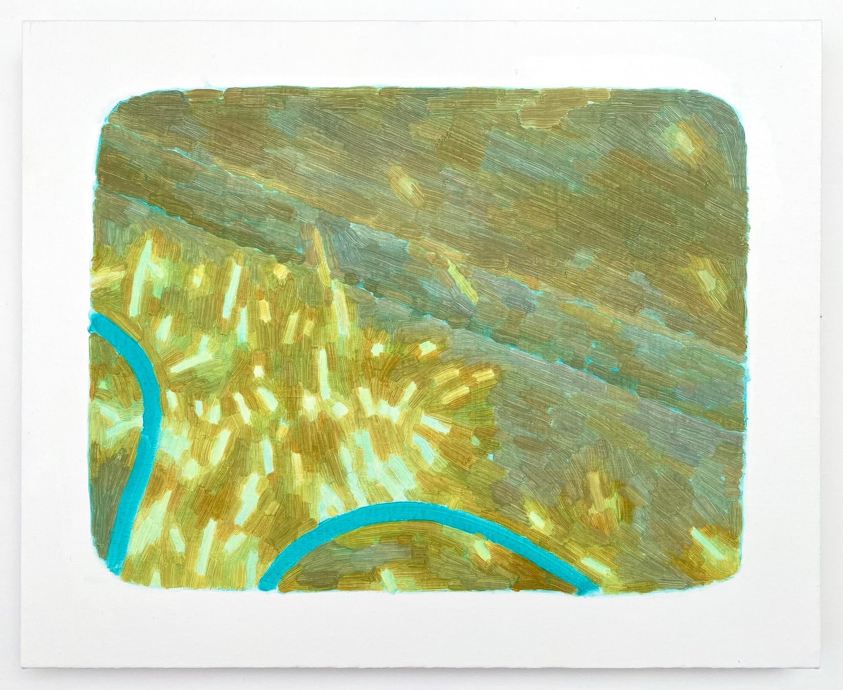 鮮やかな色彩ながら静穏な印象を与える山田千尋の絵画は、基本的に最初の一筆から油絵の具が乾燥しきる前に描き切ることで生まれる、伸びやかな筆致が特徴的です。「不安感や不快感」といったネガティブな感情をテーマにしつつ、制作の過程で、ときには同じモチーフを何度も描きながら、感情を作品に昇華していきます。