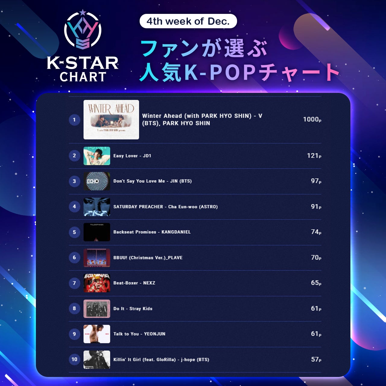 『K-STAR CHART presents POP-K TOP10 Friday』週間チャートの投票数をベースに算出された12月の累計ポイント数で決まる月間チャート1位は、BTSのVとパク・ヒョシンによる「Winter Ahead (with PARK HYO SHIN)」となり、番組内でもオンエアされました。