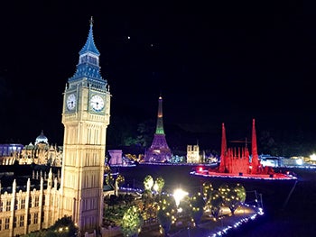 フランスのエッフェル塔やタイのワット・アルンなど、世界の有名建築物をすべて25分の1で再現した東武ワールドスクウェア。有名建築物をライトアップし、幻想的な光に輝く世界旅行が楽しめます。さらに今回はこれまでと趣向を変え、色鮮やかな和傘と建物をライトアップ。昼間とは違った夜の景色を楽しむことができる。