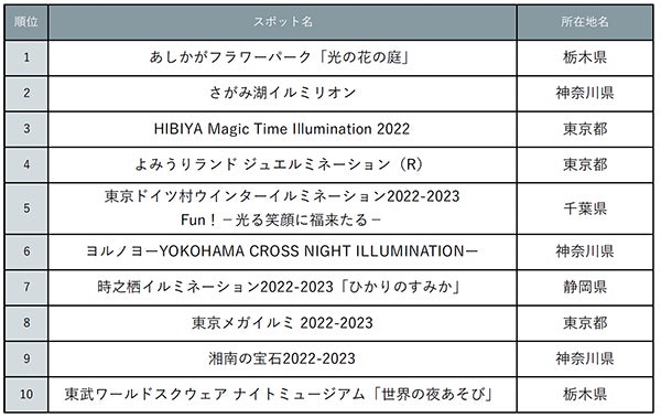 いよいよ到来するイルミネーションのシーズン。今回は首都圏近郊で開催が決定しているイルミネーションの中からアンケートを実施しました。「まるで別世界のようだ」と思うイルミネーション1位は、「あしかがフラワーパーク「光の花の庭」」が獲得。春には藤棚が咲き誇る人気のテーマパークは、「日本三大イルミネーション」にも認定されるなど、最新技術が生んだ花と光の芸術はまさに別世界のような美しさを放っています。続く2位「さがみ湖イルミリオン」は空から眺める体験型イルミネーションが充実し、スケール感あふれる光の演出が楽しめる遊園地。3位には、日比谷の街を幻想的に包み込む街中イルミネーション「HIBIYA Magic Time Illumination 2022」がランクインする結果となりました。