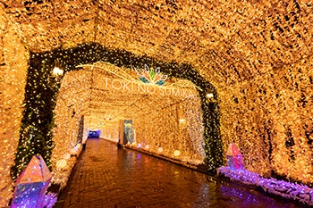 約550万球が光り輝く時之栖イルミネーション。今シーズンのテーマは、「ROYAL ROAD」~感動を求めて~。約300mの「光のトンネル」は、季節ごと、時間ごとに変化し、目と耳で楽しめる演出で何度も感動体験ができる。噴水レーザーショー「ヴェルサイユの光」は色鮮やかに進化した新プログラムを実施。初の来園者参加型イルミネーション「ツリーの森」も要チェック。