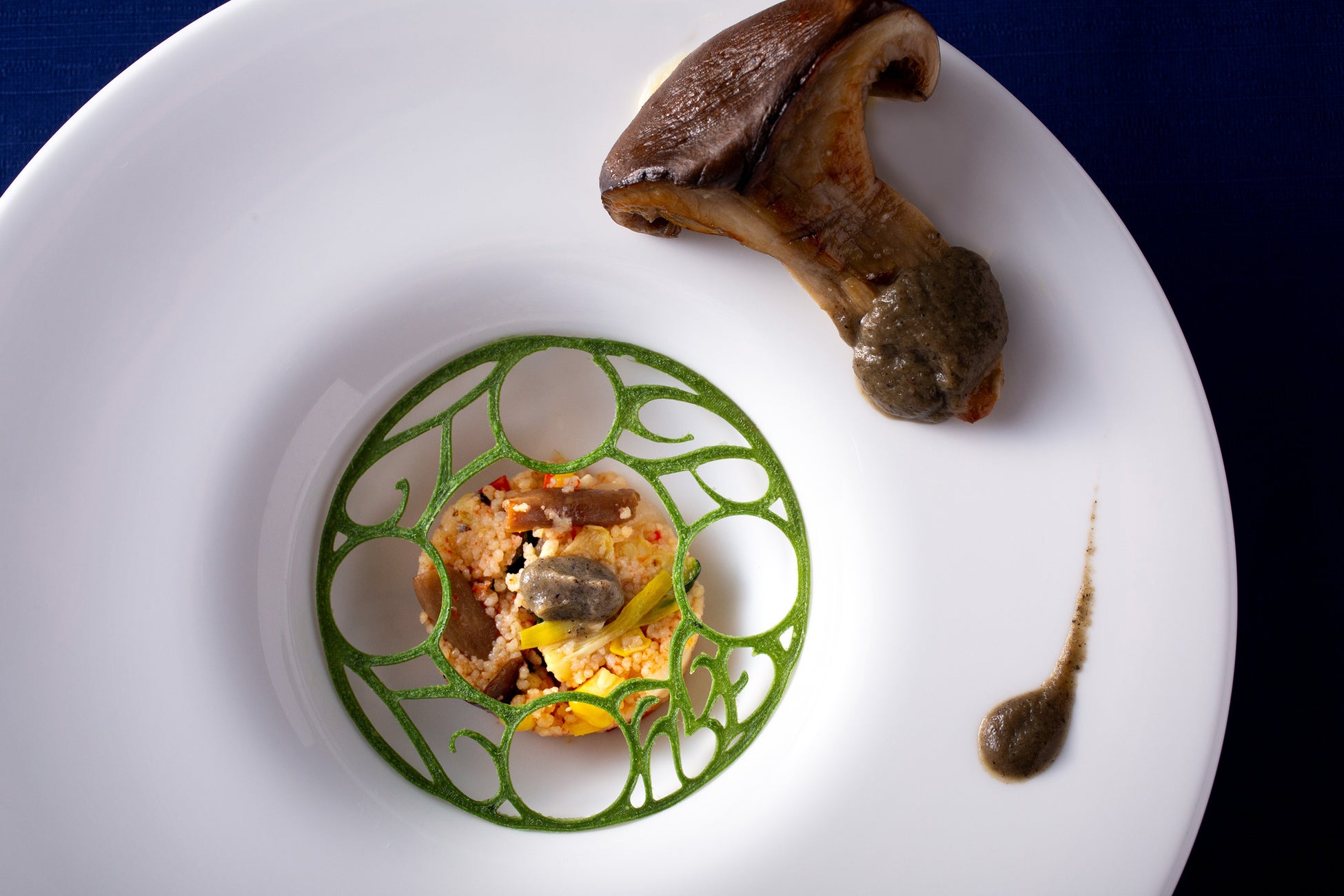 2024年6月1日(土)に日本唯一の回転展望フレンチレストランになったことを記念し、シェフ寺田が特別メニューを考案。人気のディナーコース「エトワール」の一品『京丹波あつらえ本しめじと夏野菜のタブーレ ひさみのへしことレッチーノ種黒オリーブの京都風タプナードソース』をアレンジしました。滋味深い味わいのあつらえ本しめじとともに愉しめる夏らしい仕立ての料理には、店名である「TOP OF KYOTO」が刻まれた円形のチュイルが添えられています。この円形のチュイルは、回転展望レストラン店内の特徴的な形と、店名のスペルに4つのOが存在することから着想を得て創作しました。