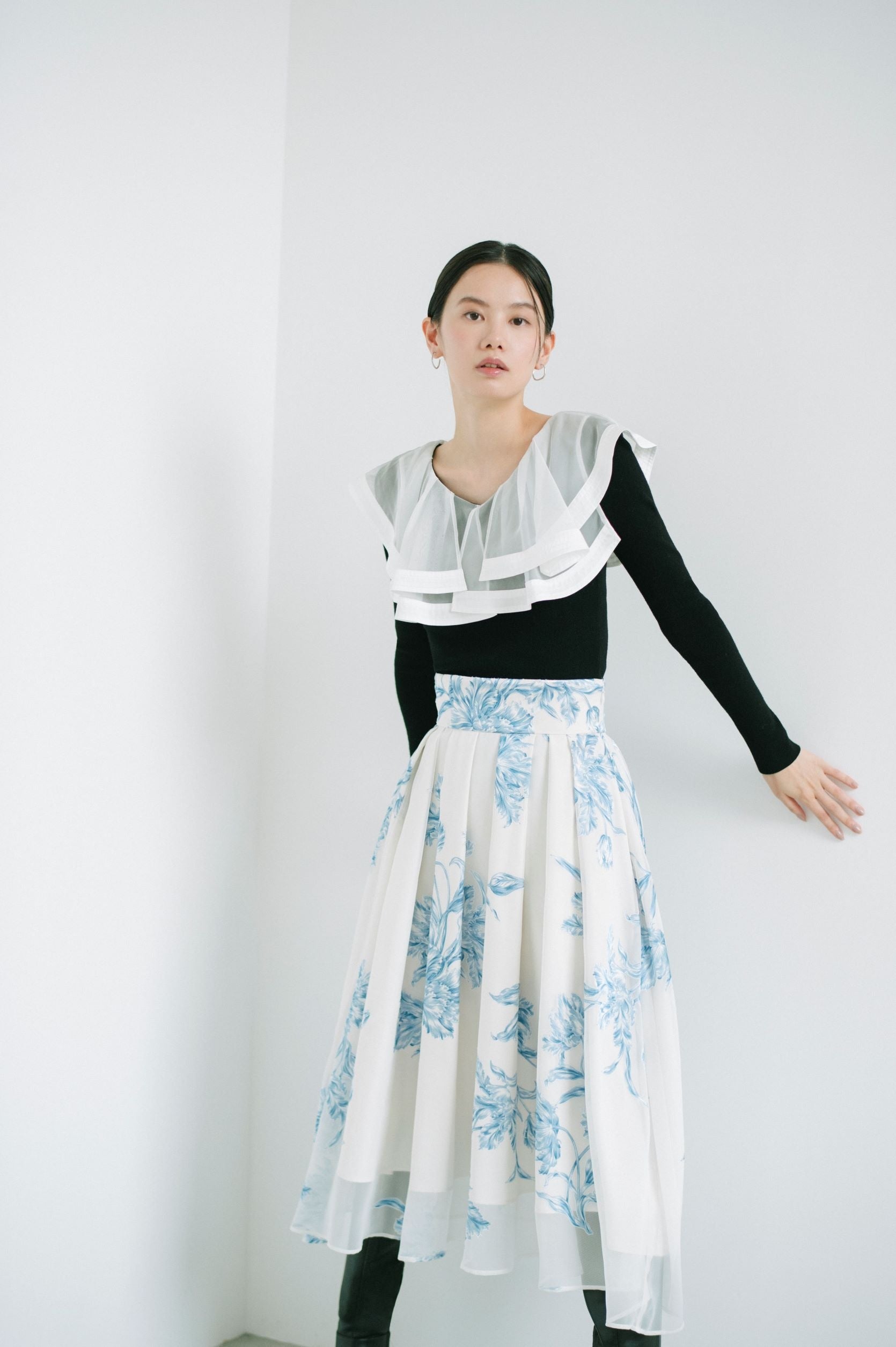 オパールのシアーな生地にクラシカルなチューリップ柄をプリントした、華やかで存在感のあるスカート。