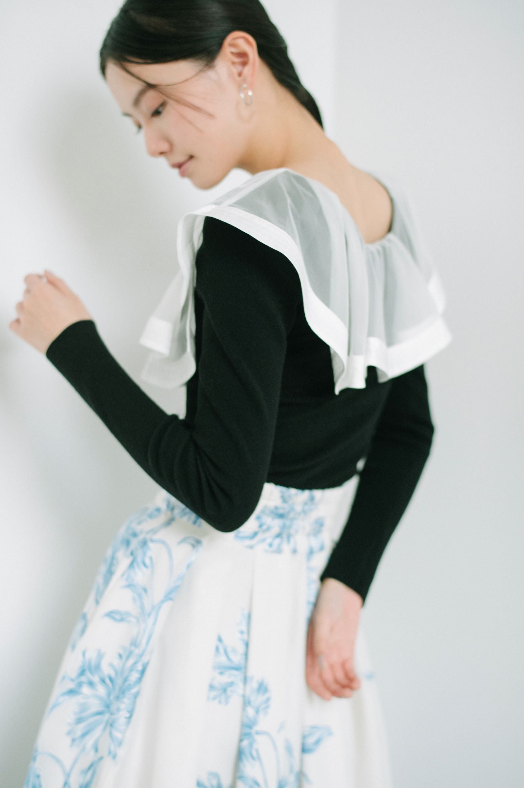 オーガンジーで切り替えたフリルカラーが目を引く、エレガントなニットプルオーバー。